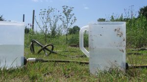 This month, I constructed a water level based on a couple of old dry-goods containers and a garden hose, using bulkhead fittings from the hardware store. It works! I was able to make a series of two point comparisons for all four corners of each of the ocean storage units that comprise the studio.