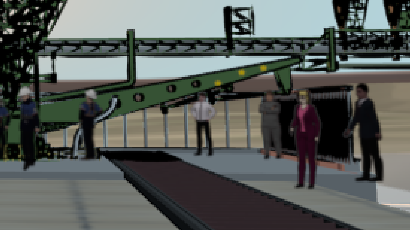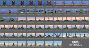The technique is working — the figures you see here are all billboard extras with animated “image sequence” textures, so they change poses in short loops, creating the effect of movement captured at periodic intervals while people are working. Of course, the mechanism and the sunrise move smoothly.