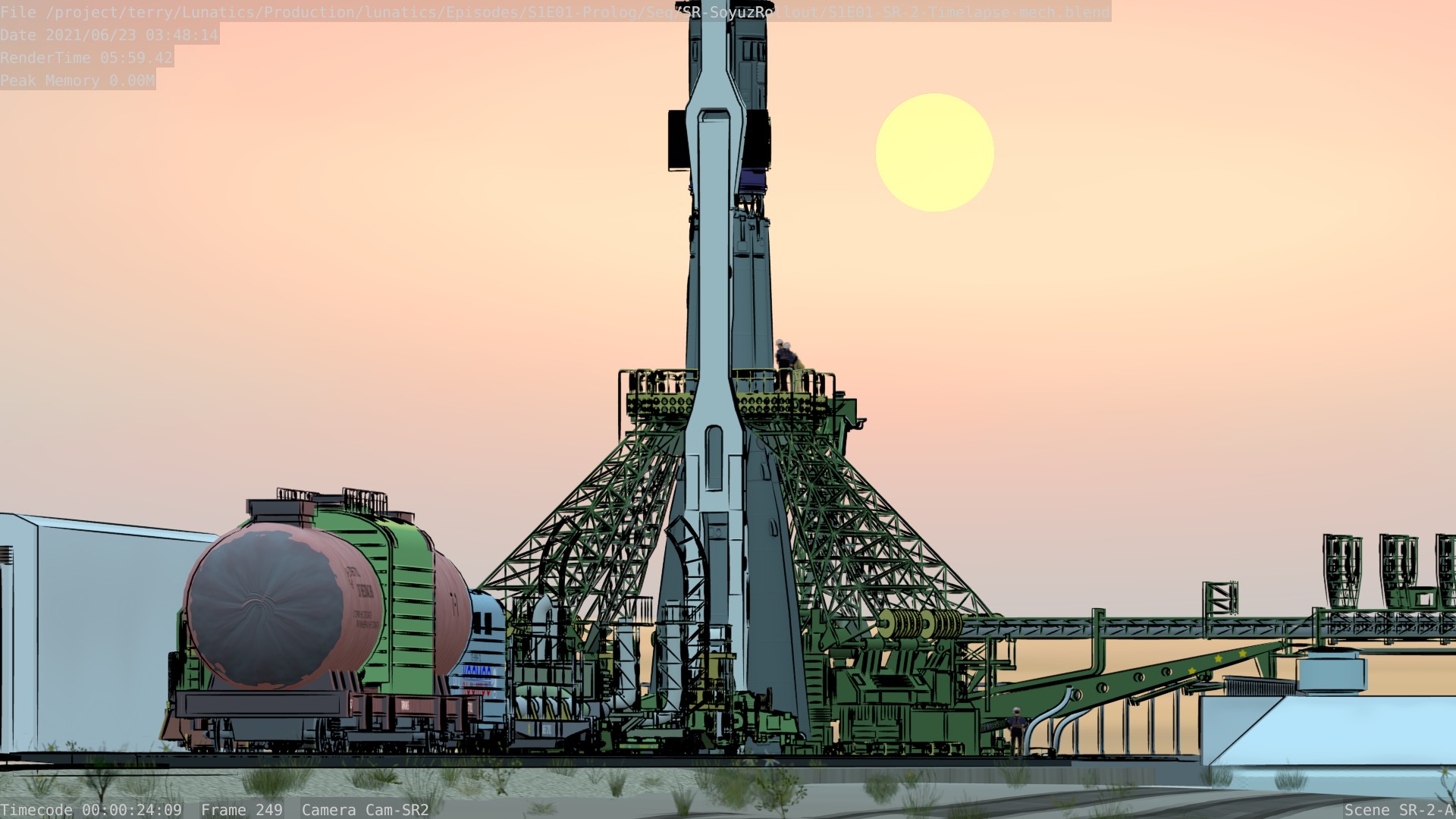 Finished up the “Timelapse” sequences, adding the animated padcrew billboard characters to the shots. Reconstructed the SR-1 shots, with the updated LaunchPad Mech.