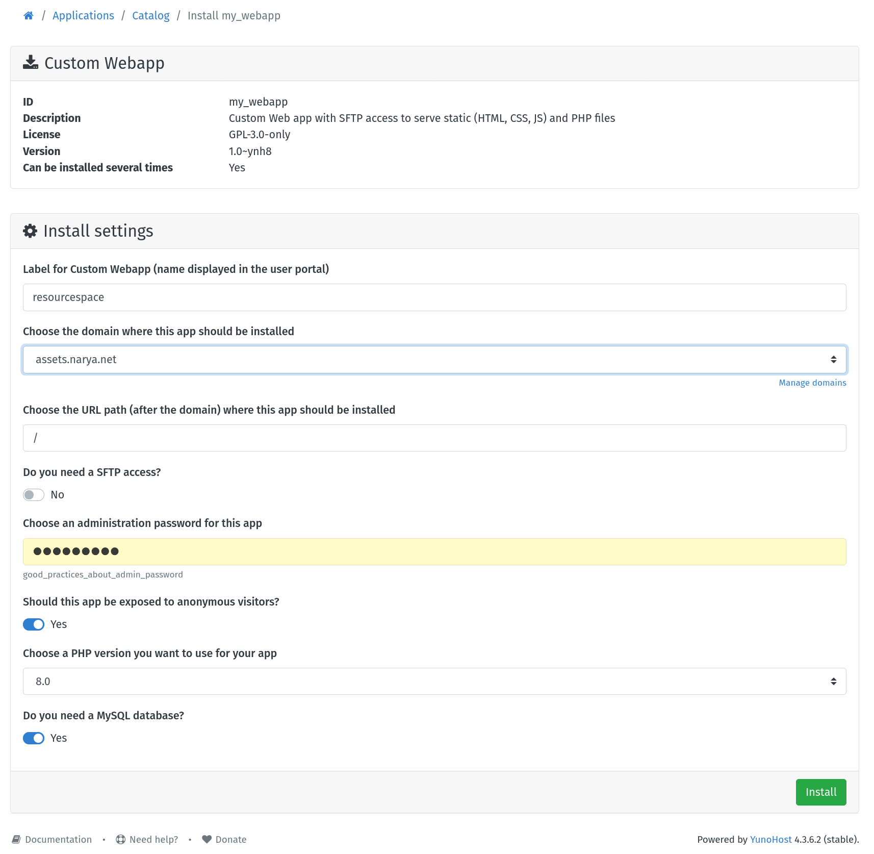 For my next trick, I needed to install Resource Space from scratch (as opposed to just restoring a backup from my old site), into a YunoHost “Custom Webapp” installation.