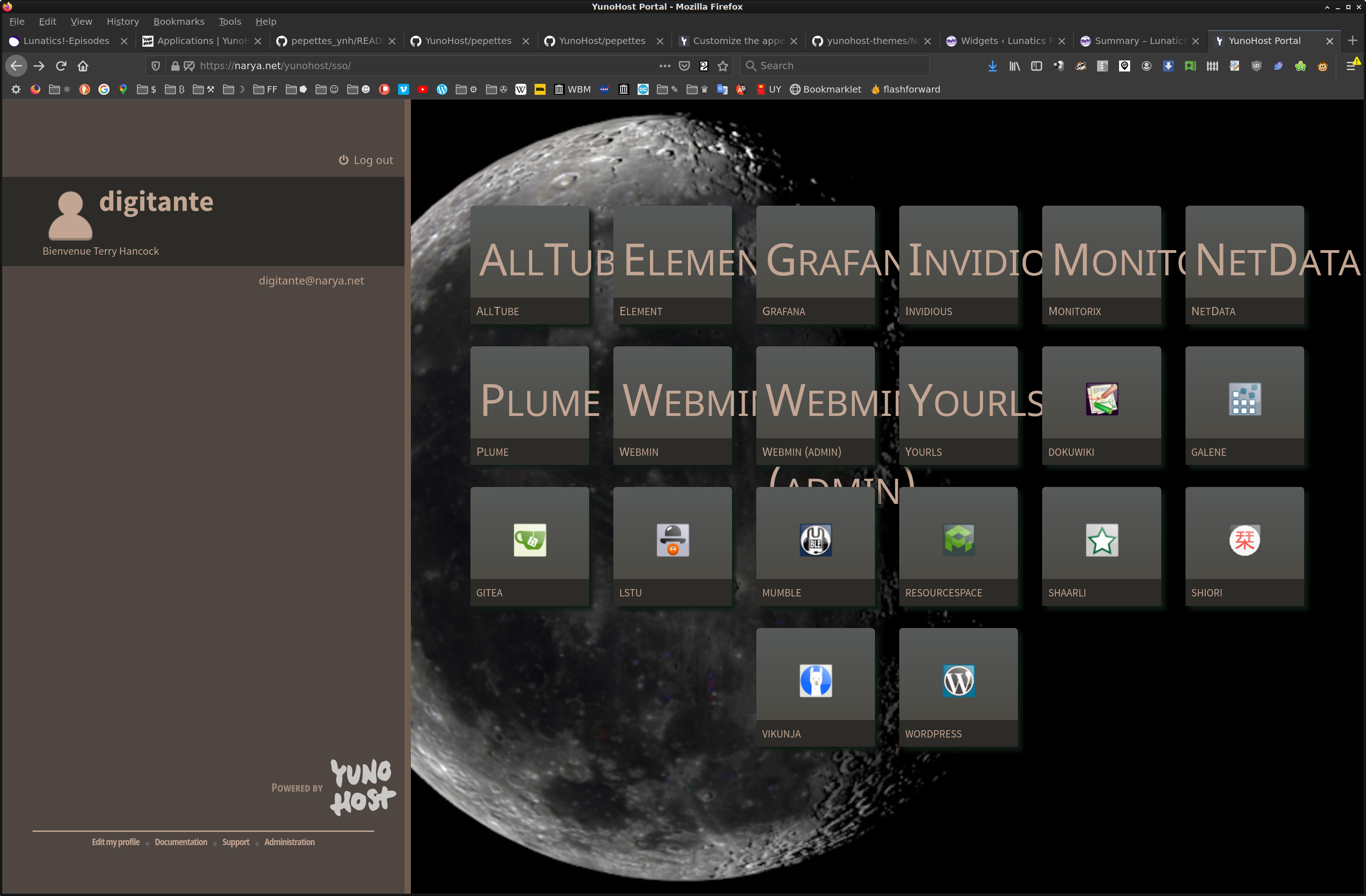 The little cloud icon in the lower right hand corner is a link back to the YunoHost Portal, this is an overlay that YunoHost places over most apps. Sometimes it is annoying, because it’ll be displayed over an important button. Fortunately, it can be dragged to another part of the window. Took me awhile to discover that! (Also, in the default theme, the icon says “YUNO HOST”, rather than showing this cloud).