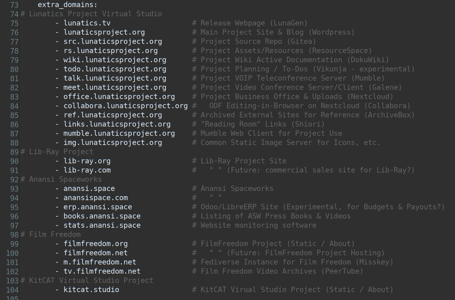 I originally planned to resolve this by simply running ResourceSpace and my static HTML content on a separate droplet VPS, using my old management scripts. This would probably have worked fine, although the rent on two droplets would increase my hosting costs (which are probably going to go up with this transition anyway — I’m installing more demanding applications and need to pay for more RAM and multiple “virtual CPUs” for adequate performance).