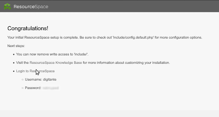 There’s just a few more things to set up, and then submit, and after a bit, you will get a confirmation that the install worked. If the application files do note have the correct ownership and permissions, as described above, you’ll get a blank page with just the “ResourceSpace” logo on it at this point. Fixing the file ownership (chown) and permissions (chmod) and (possibly) restarting PHP and Nginx services again, should fix it, if that happens.