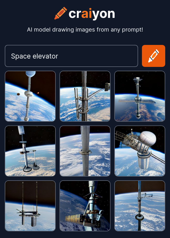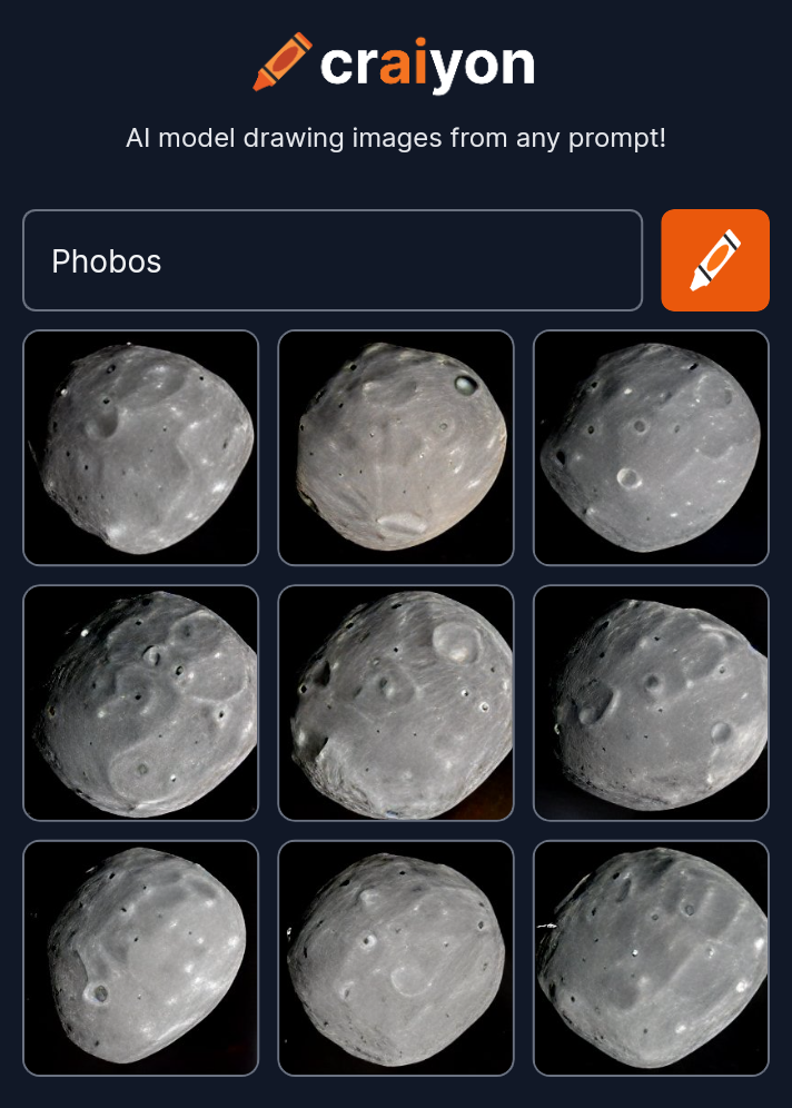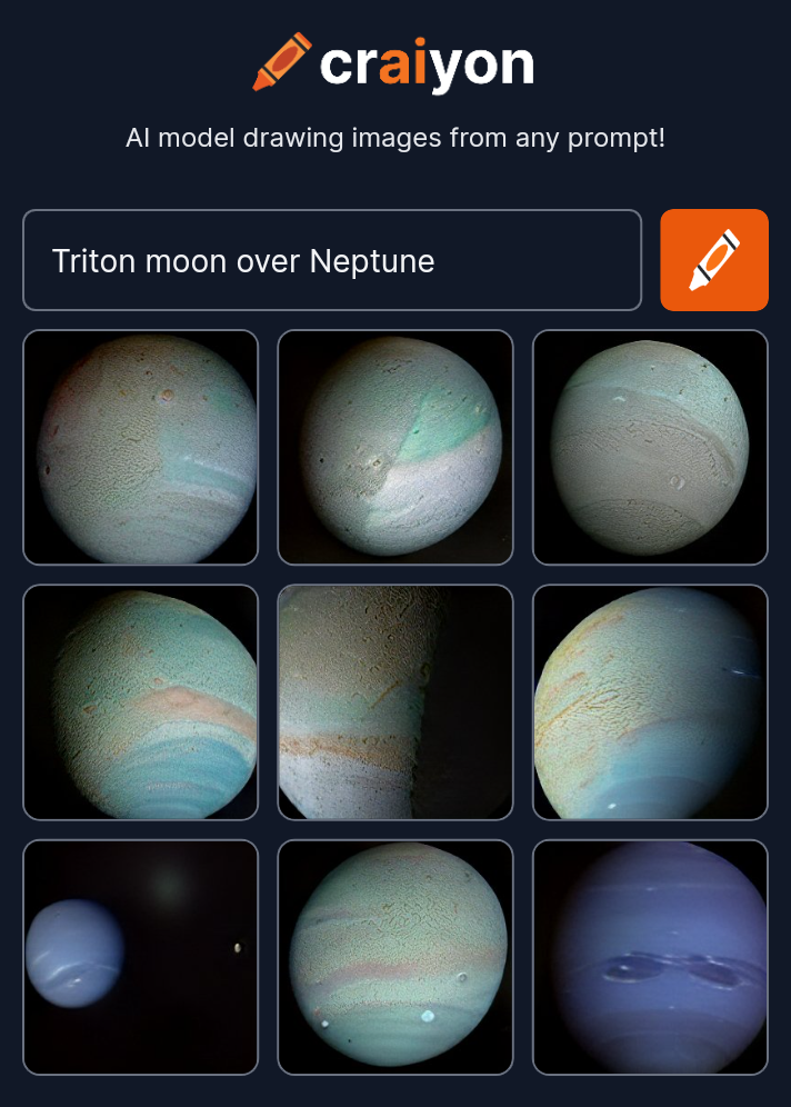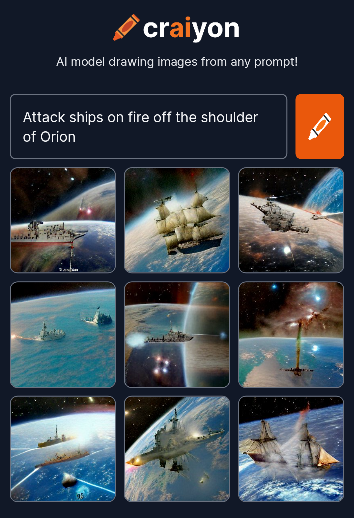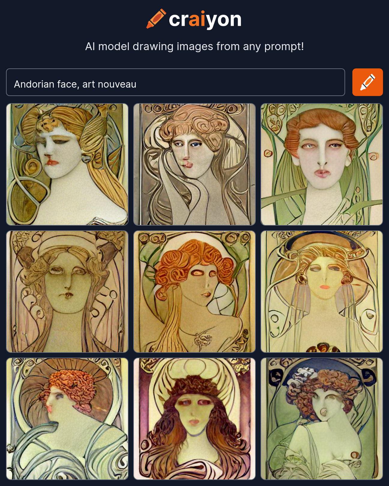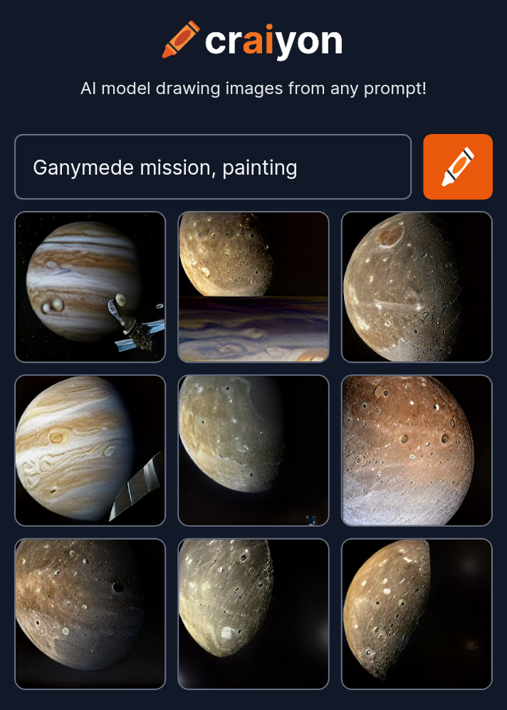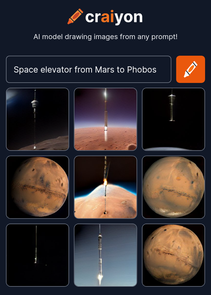 I was getting low on the allowed queries on my “basic” MJ account, so in the middle of the month, I did some tests with a different AI art generator, Craiyon. Craiyon doesn’t have the same nice terms as MidJourney and doesn’t generate the high-resolution images, but it is free to use, and provides a nice way to explore the technology.