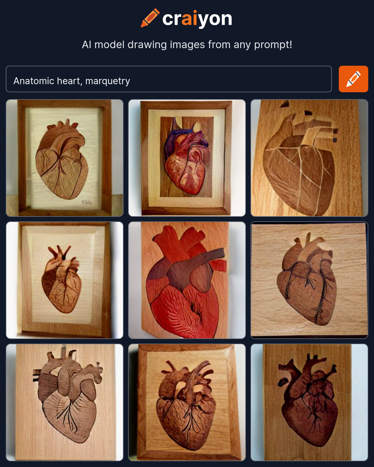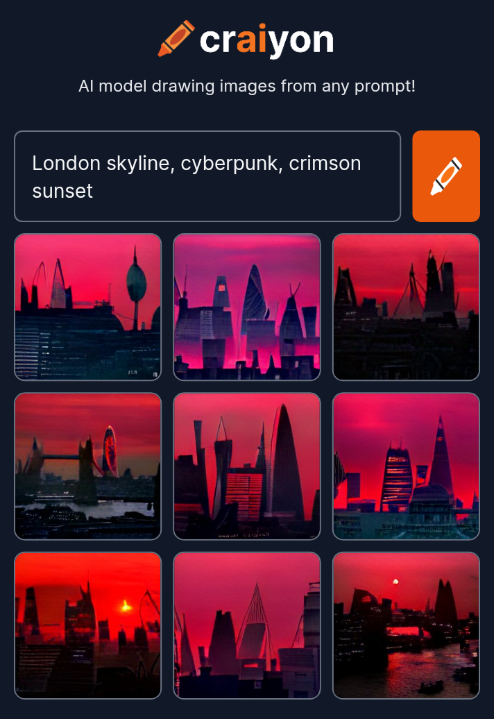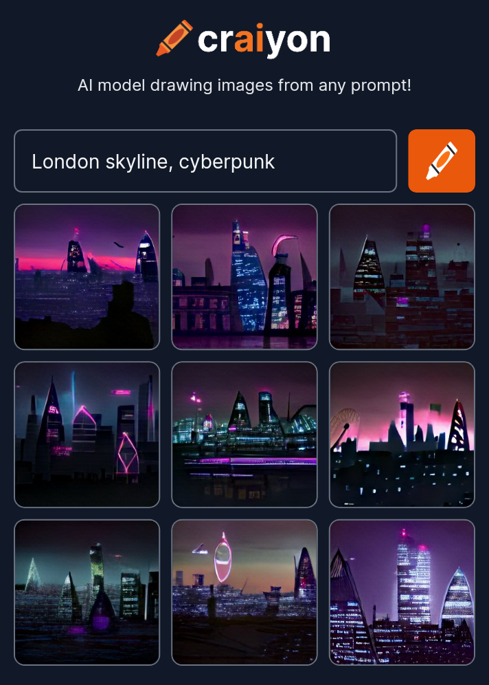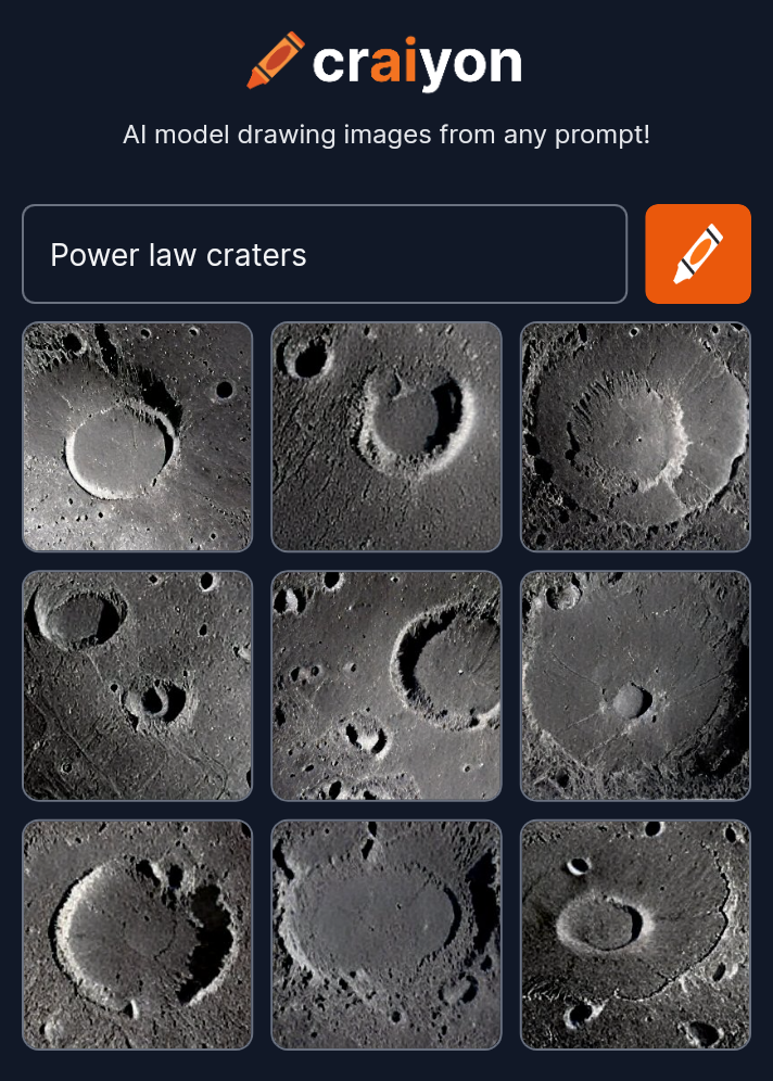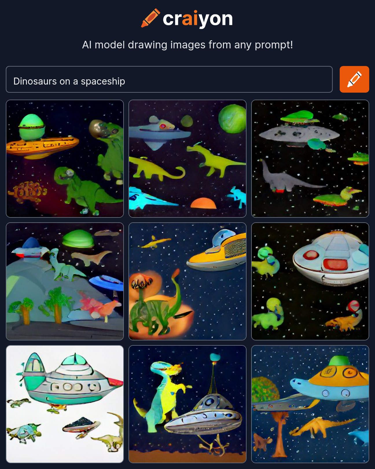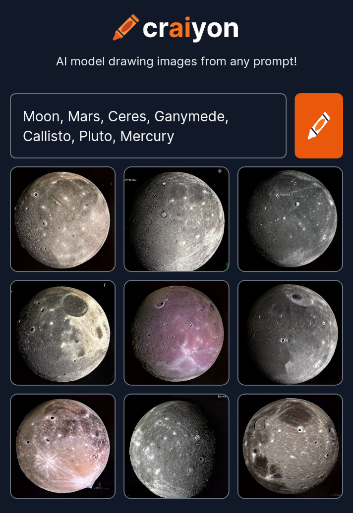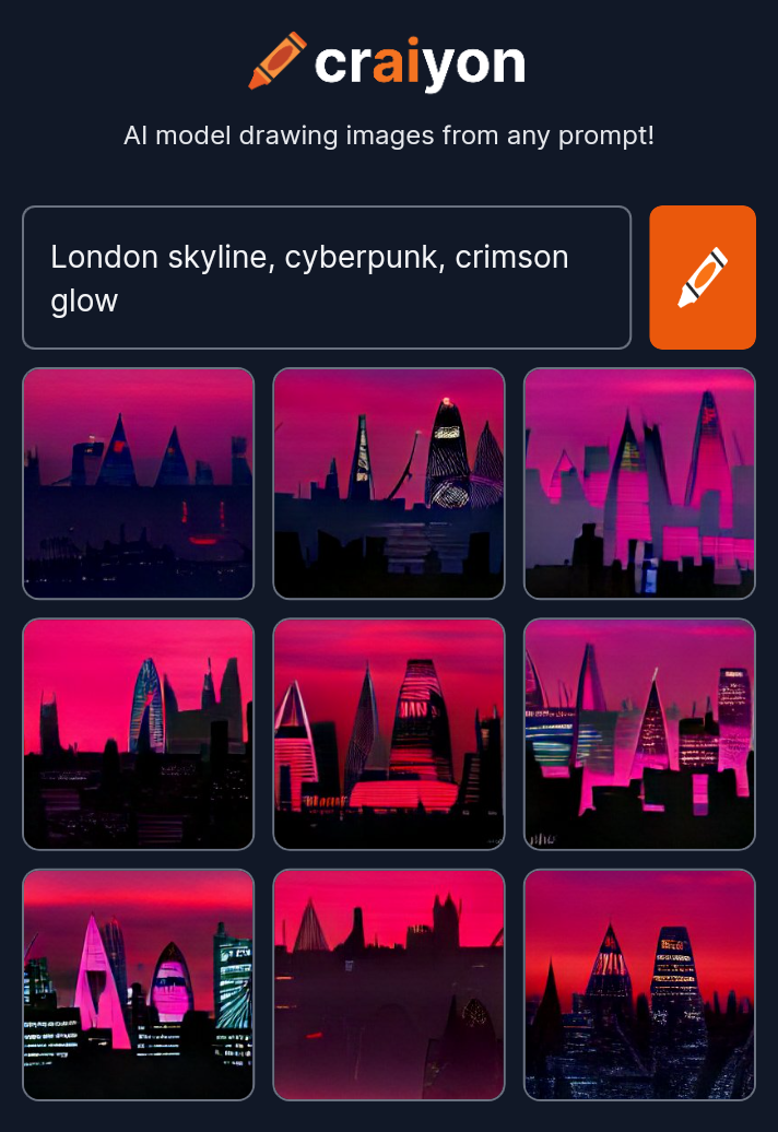 I was getting low on the allowed queries on my “basic” MJ account, so in the middle of the month, I did some tests with a different AI art generator, Craiyon. Craiyon doesn’t have the same nice terms as MidJourney and doesn’t generate the high-resolution images, but it is free to use, and provides a nice way to explore the technology.