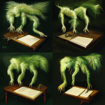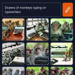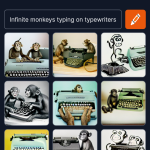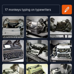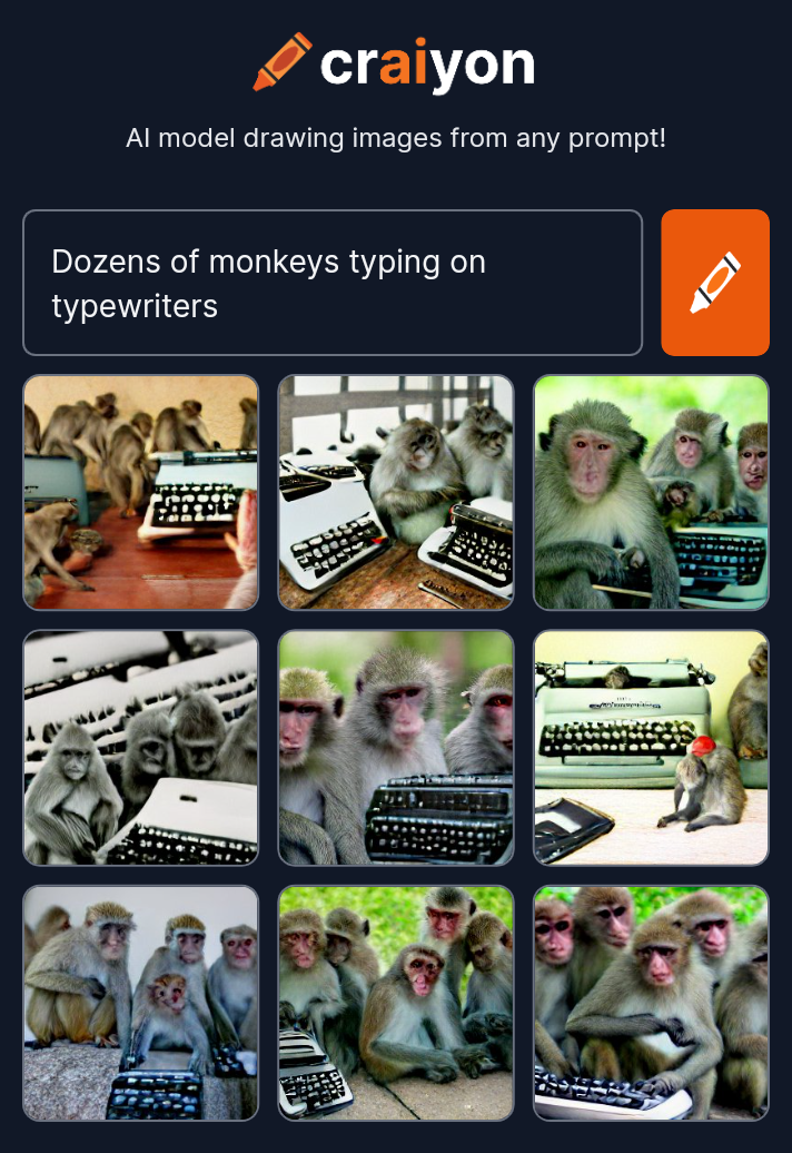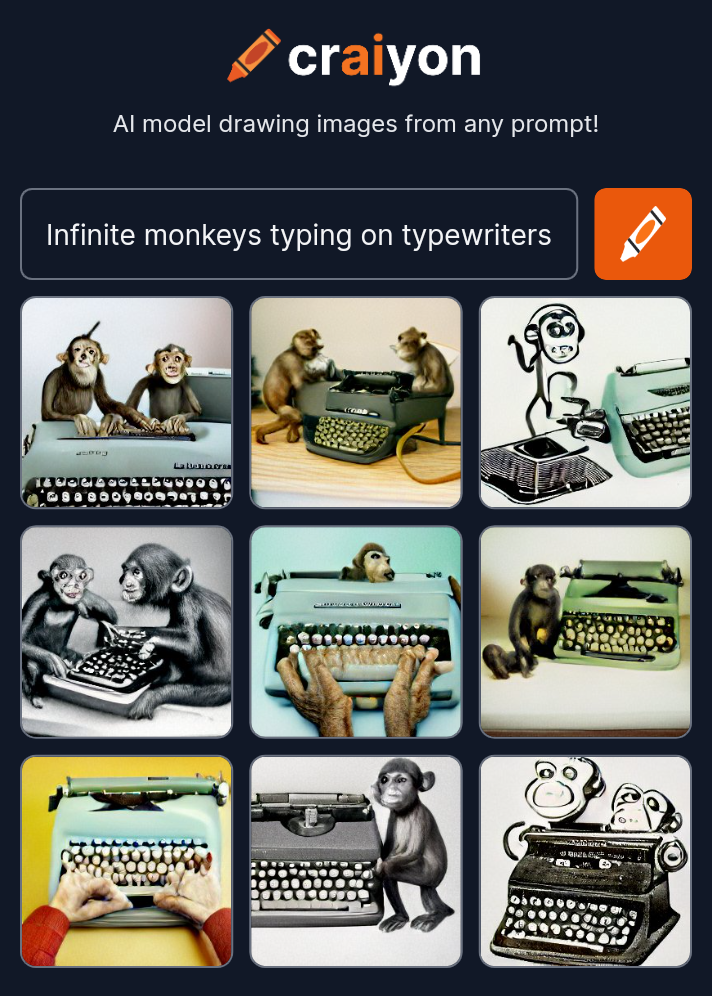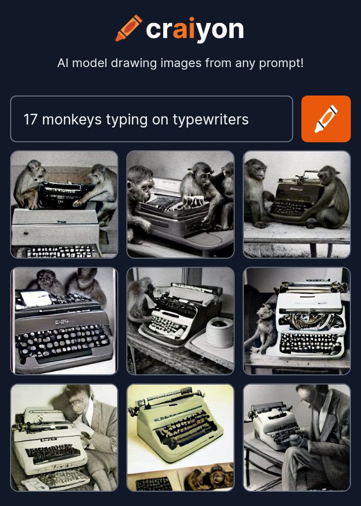 And I discovered that Craiyon really doesn’t have a very good concept of numbers, which is kind of ironic for a computer. But asking for a specific number of monkeys at typewriters doesn’t work, and vague number terms didn’t work much better: