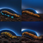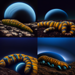 The lead image here is NOT exactly from MidJourney, it’s a combination of two MidJourney prompts. This one with the caterpillar creature and the prototype for the planet in the sky: