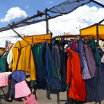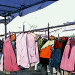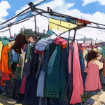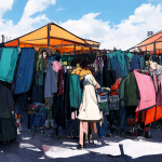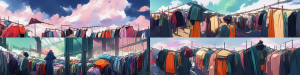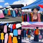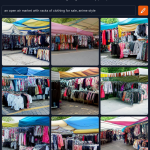 But let’s see what MidJourney can do for me, with a prompt like “an open-air market with racks of clothing for sale, anime style”: