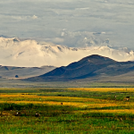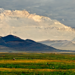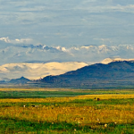 It isn’t perfect. The grass is too green, and it’s hard to tell whether those are clouds or snow-capped peaks in the very back (to be fair, it’s sometimes hard to tell that in real life). But a little quick work in Gimp can fade the grass and provide a fuzzy clip-line for the mountain peaks. It can also be used to stitch several similar panels into a very long horizon-backdrop.