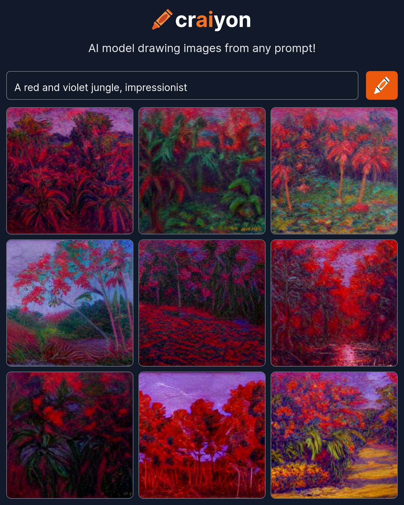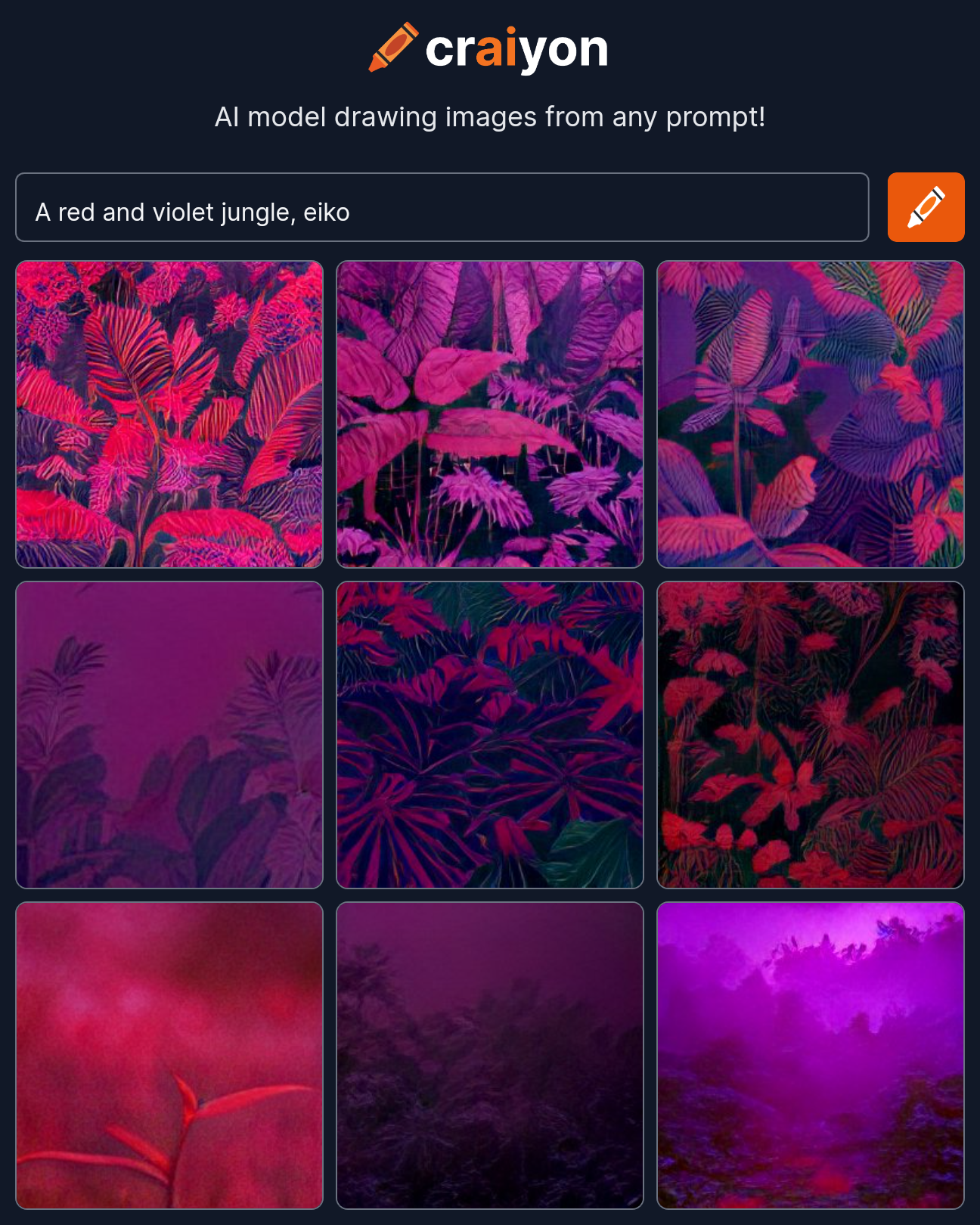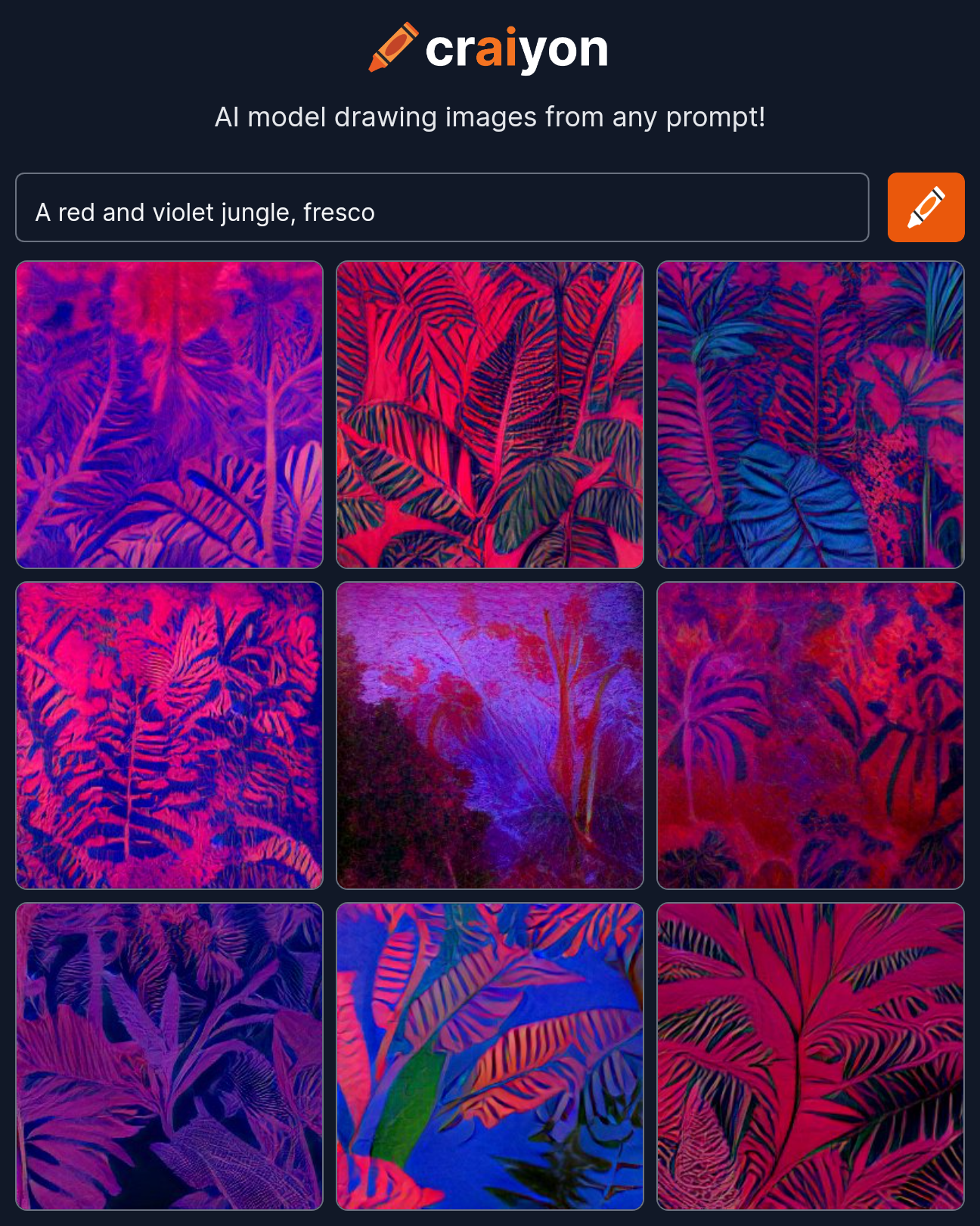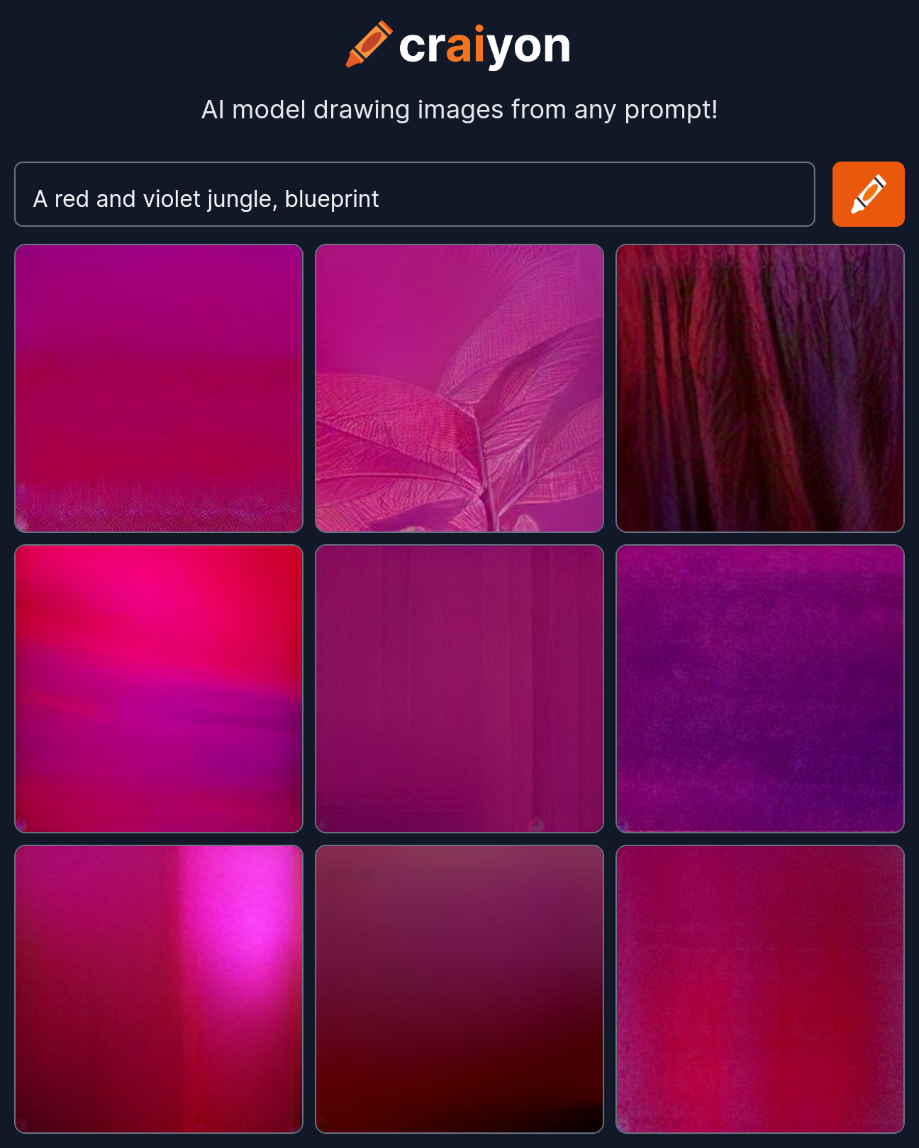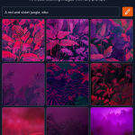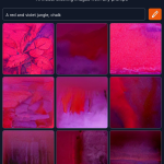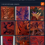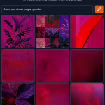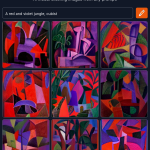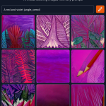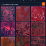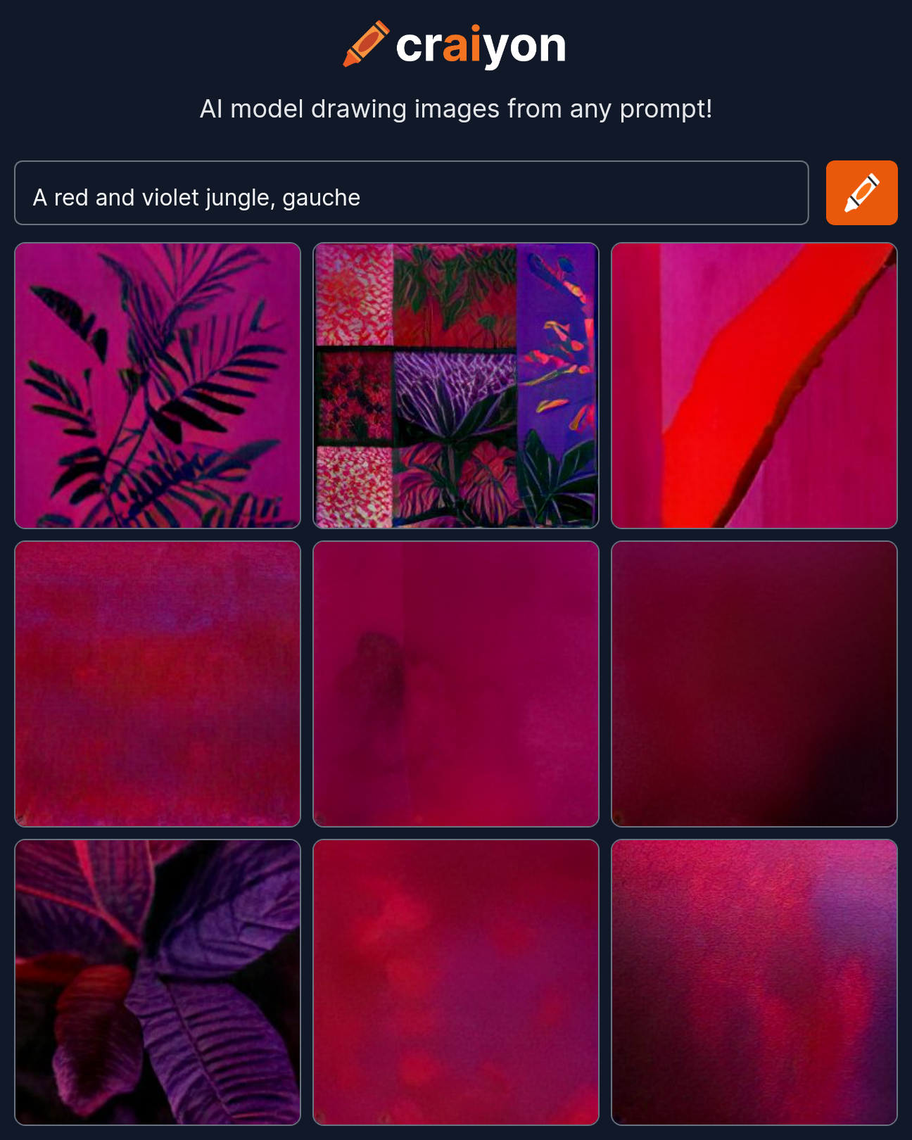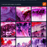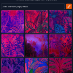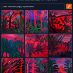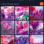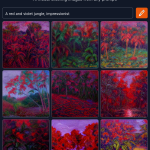 Then I tried a large range of stylistic variations on the same simple prompt “a red and violet jungle” (the success with the skyline above suggested that some of the style prompts might work on Craiyon much as they do on MidJourney):