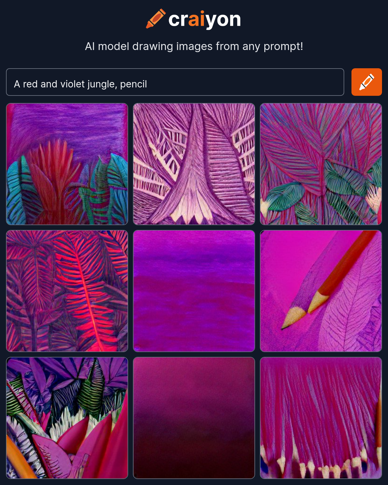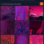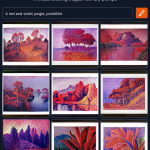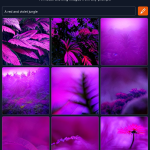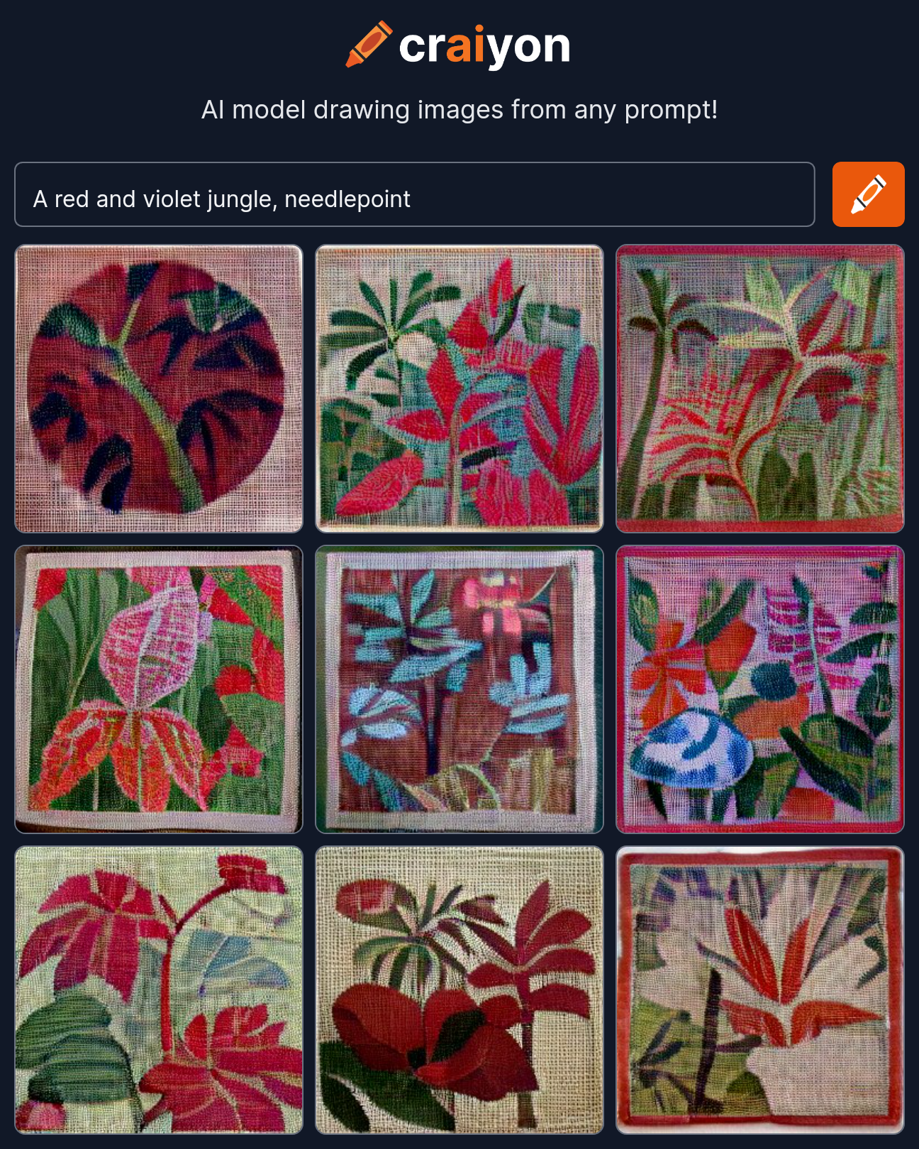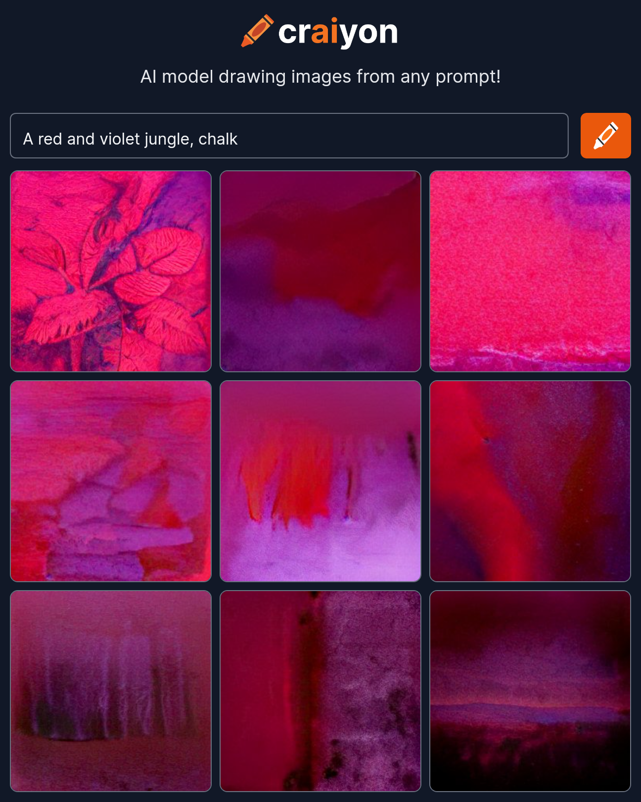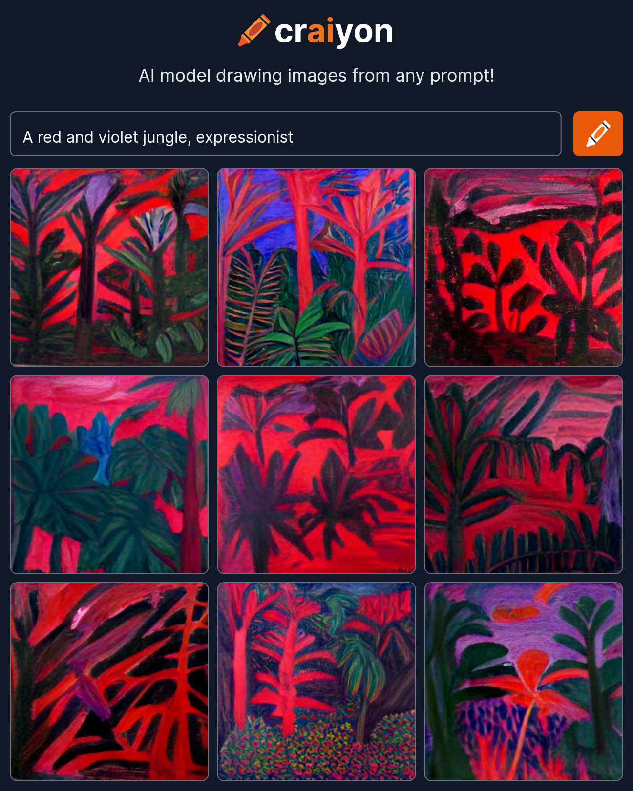 Then I tried a large range of stylistic variations on the same simple prompt “a red and violet jungle” (the success with the skyline above suggested that some of the style prompts might work on Craiyon much as they do on MidJourney):