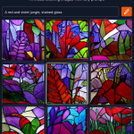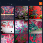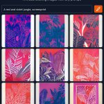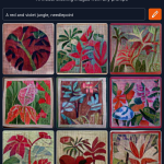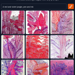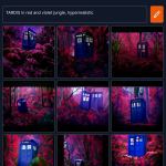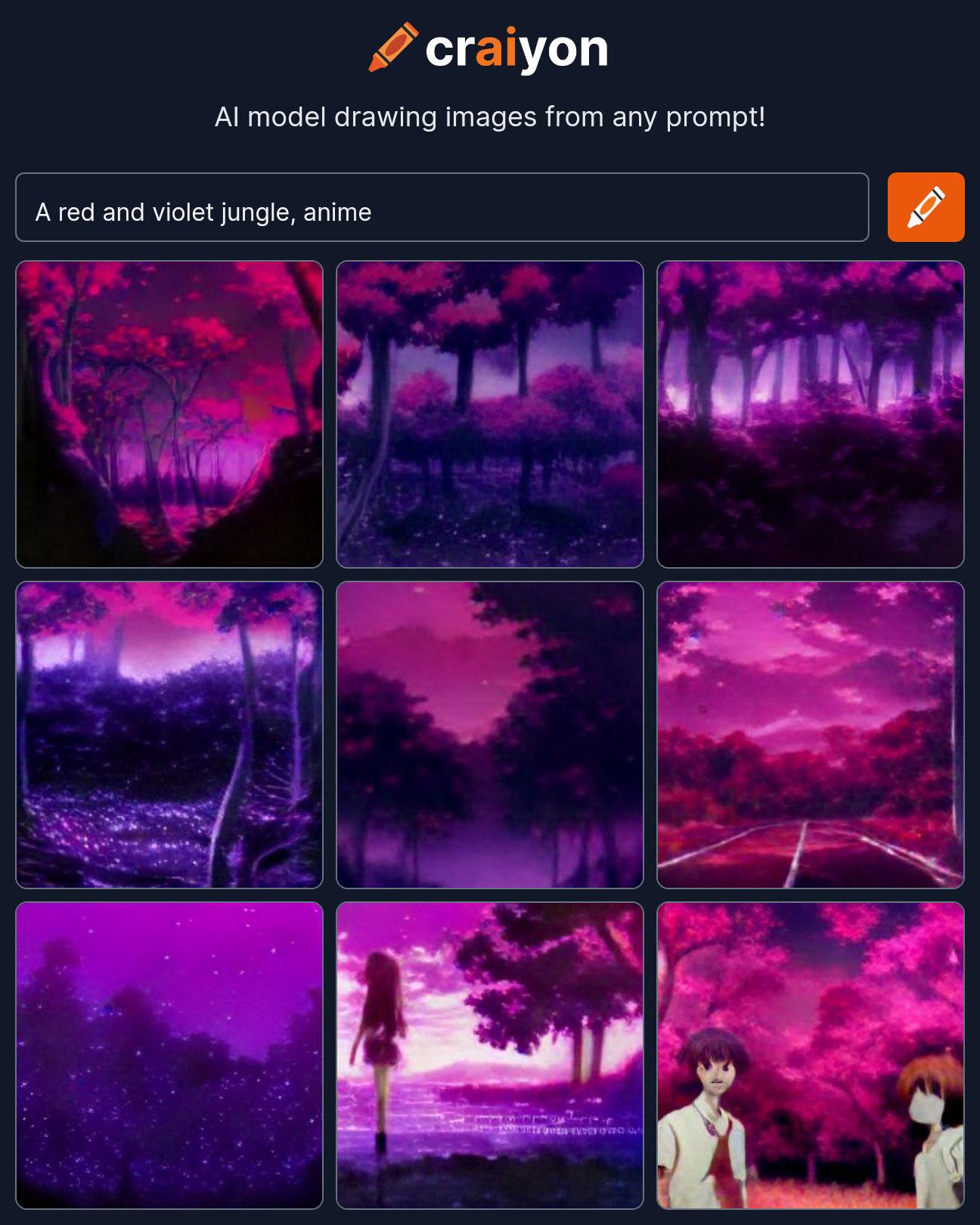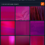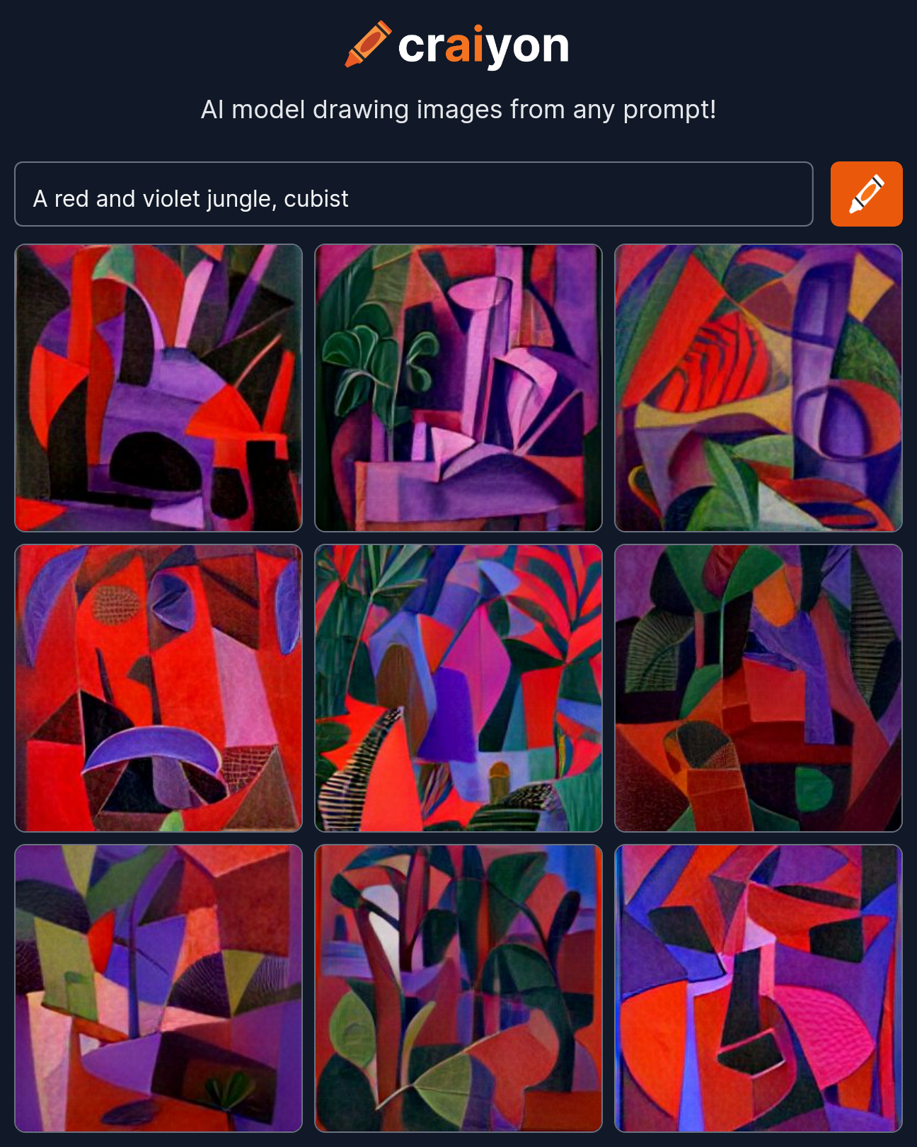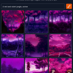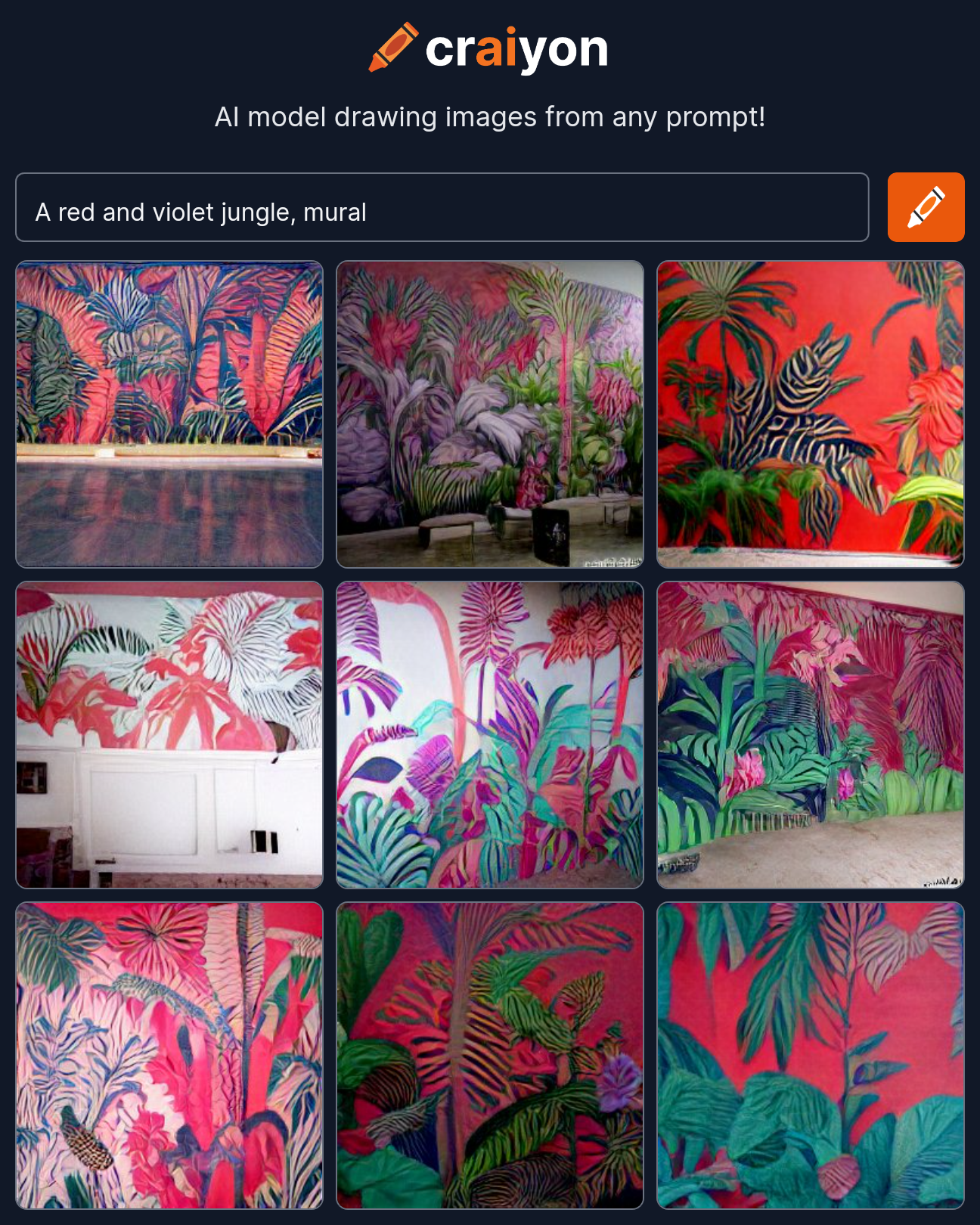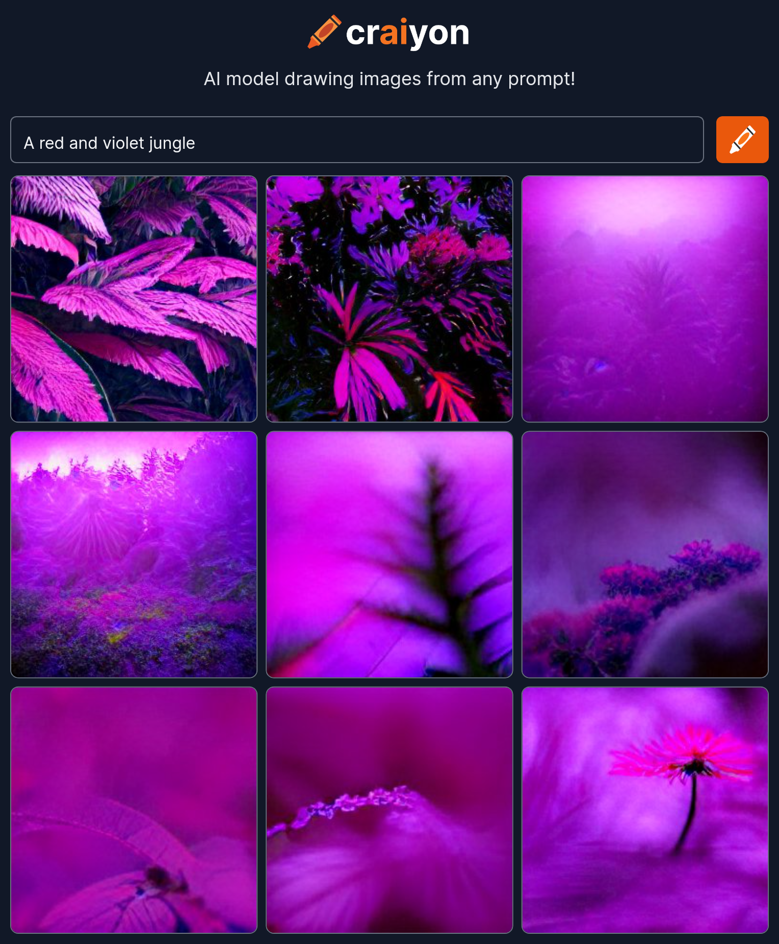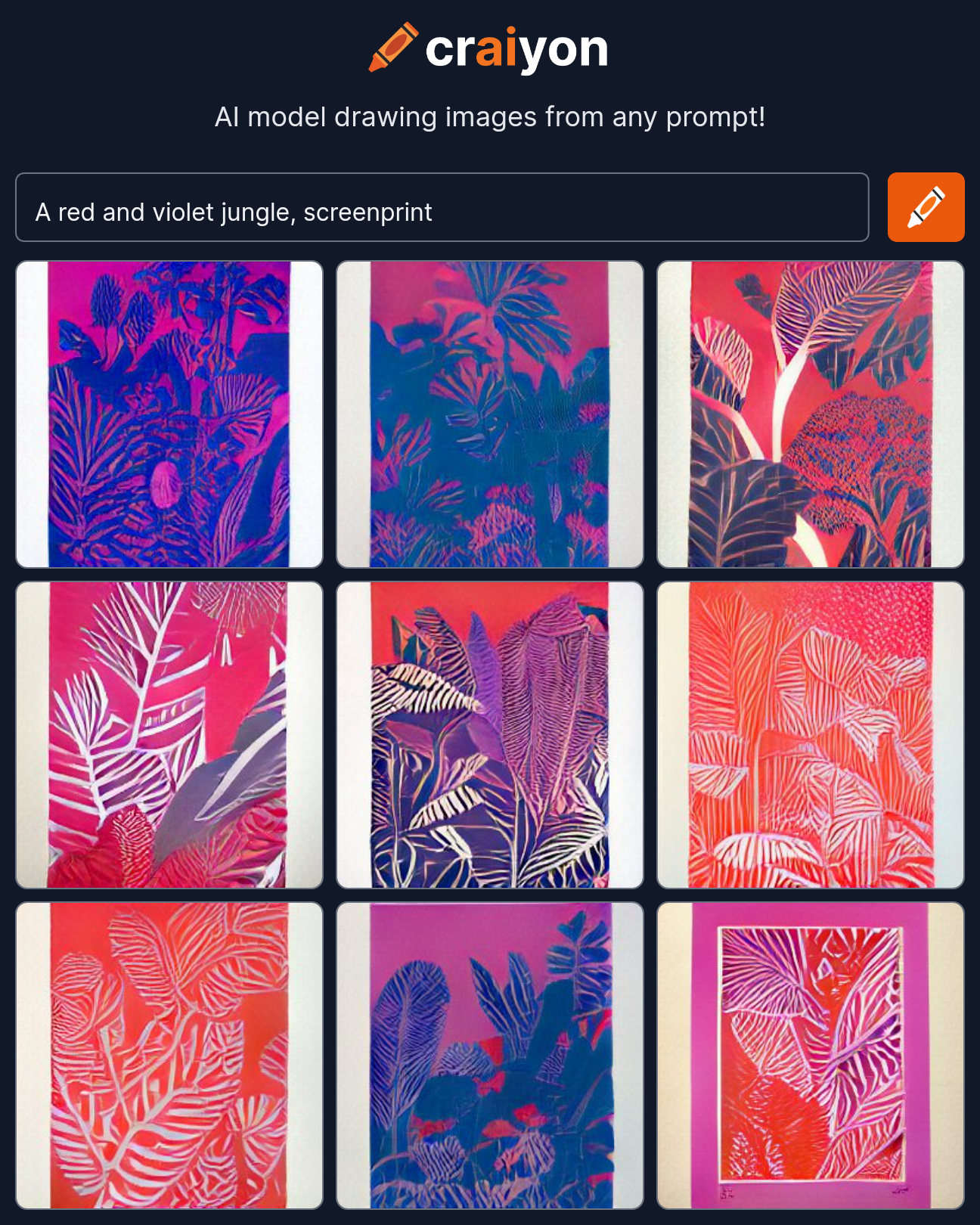 Then I tried a large range of stylistic variations on the same simple prompt “a red and violet jungle” (the success with the skyline above suggested that some of the style prompts might work on Craiyon much as they do on MidJourney):