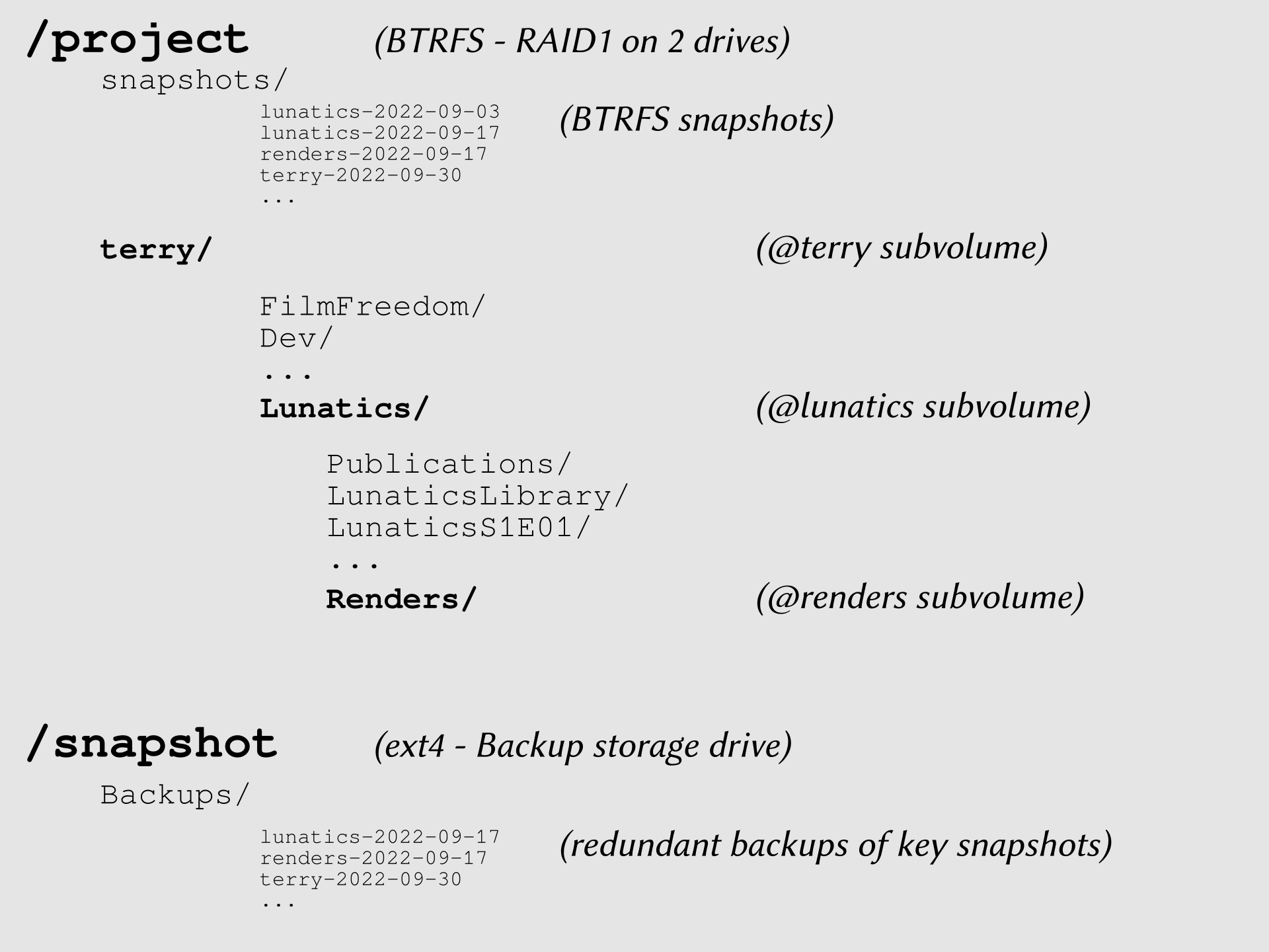As I understand it, with this configuration, snapshots of ‘terry’ will not contain Lunatics or Renders content, but only the other regular folder content in that subvolume. Snapshots of ‘lunatics’ will have the regular folders under ‘Lunatics’, but not the ‘Renders’ subvolume.