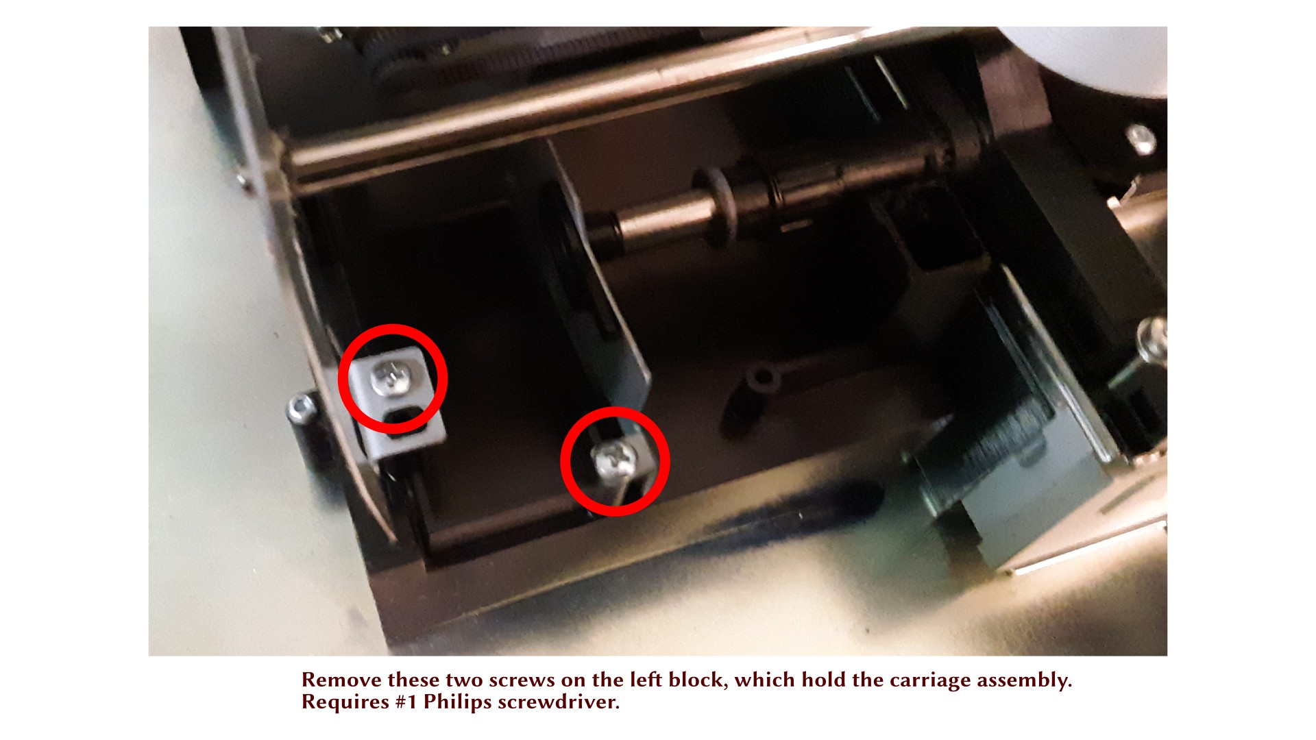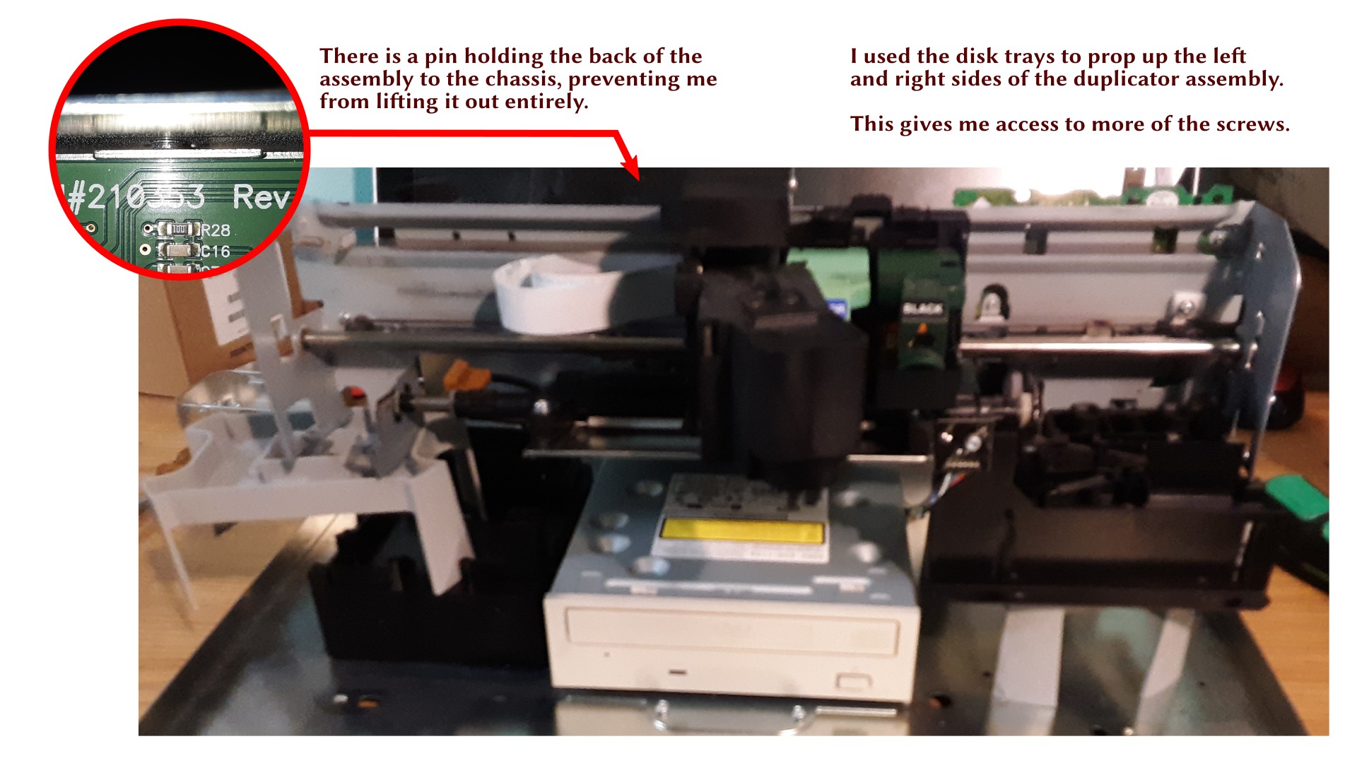 To make matters worse, one of the screws holding the left side block (the one shown in the illustration above) is directly under the rail, so I can’t get a screwdriver on that, either. As a result, I had to detach the rail assembly from the block first, then remove the block, and then I could get to the screws on the DVD. See the next section for illustrated steps.