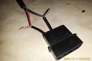 I cut the cable, then wired it into a Molex connector from an old PC power supply cable, soldered it, and wrapped it with electrical tape (I happened to have white electrical tape on my bench at the time — black would probably have looked nicer, but you won’t be able to see this when the duplicator is assembled).