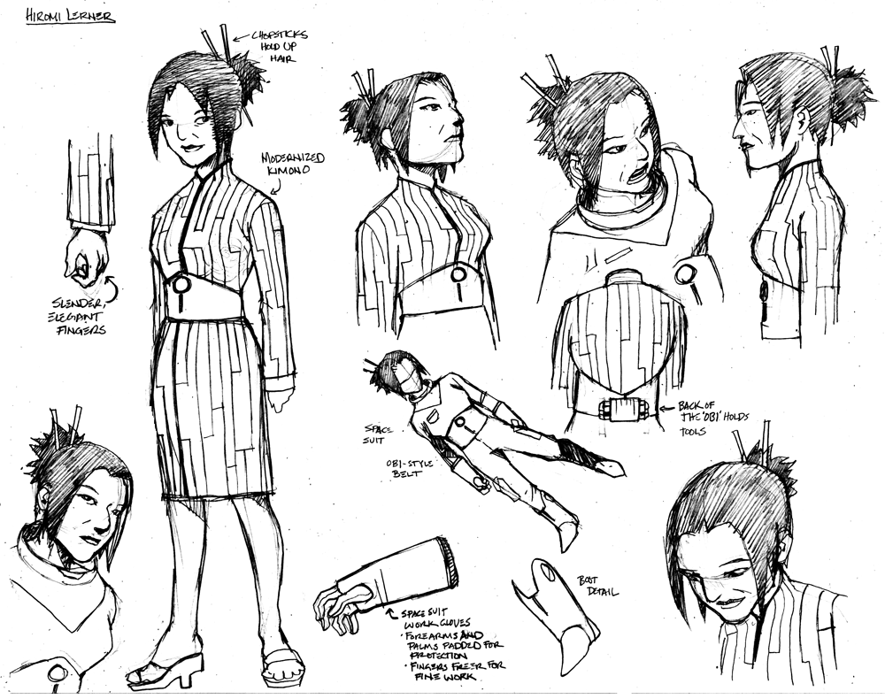 During the process, Andrew Pray, did create models for the spacesuits and the first version of Georgiana & Hiromi in spacesuits, which looked quite different from the model we settled on, and wasn’t not super-accurate to the concept art, but I was happy to let Andrew introduce his own style, thinking that it would be applied to all the characters, so they would be consistent.
