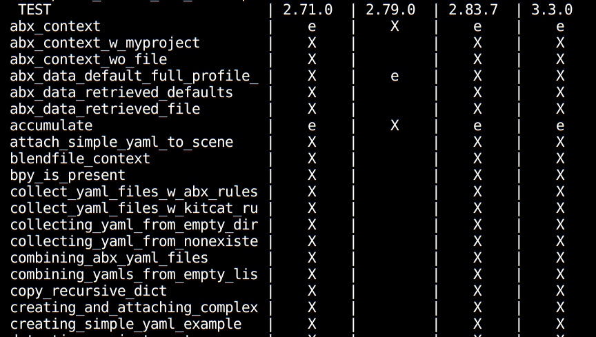 I have been hoping to continue refactoring LunaGen to make it more useful outside of Lunatics Project (I do have other sites I want to manage, and also this might make it useful to other people). With ABX, a major limitation is that I have only got it to work in Blender 2.79, which is getting increasingly obsolete by now, and I want to use it for compositing, which I hope to get working in a later version of Blender (a moving target, but currently this would probably mean Blender 3.6.5 LTS). This means that I need a practical solution for testing ABX across multiple versions of Blender automatically. Testing for Blender Add-Ons is already complicated by the fact that they need to run in Blender, and this multi-version requirement means they need to: