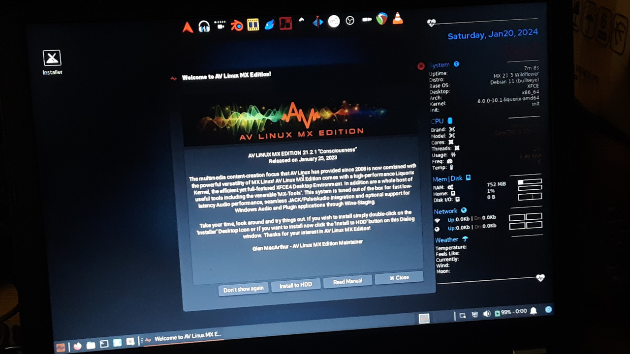However, in researching it, I found that Kali was a little too specialized, and probably not a good “daily driver” O/S. So I took the easier option of just installing the same AV Linux that I put on Sintel. This way my experience will carry over.