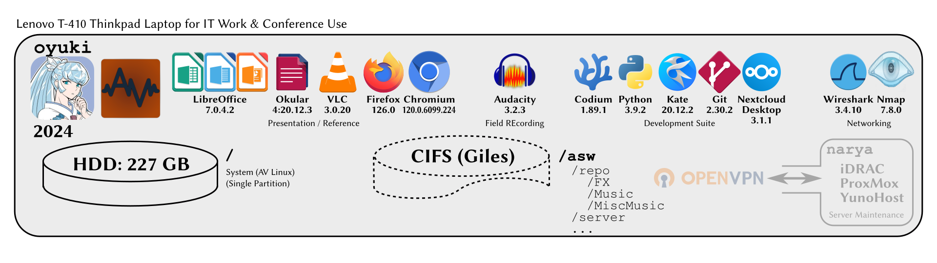 “Oyuki” was originally a different laptop, but I’ve retained the name, which is a for a supporting character in Urusei Yatsura — the Snow Queen of Neptune, noted for her business acumen. Because it’s the laptop I plan to take on trips for business use and IT work.