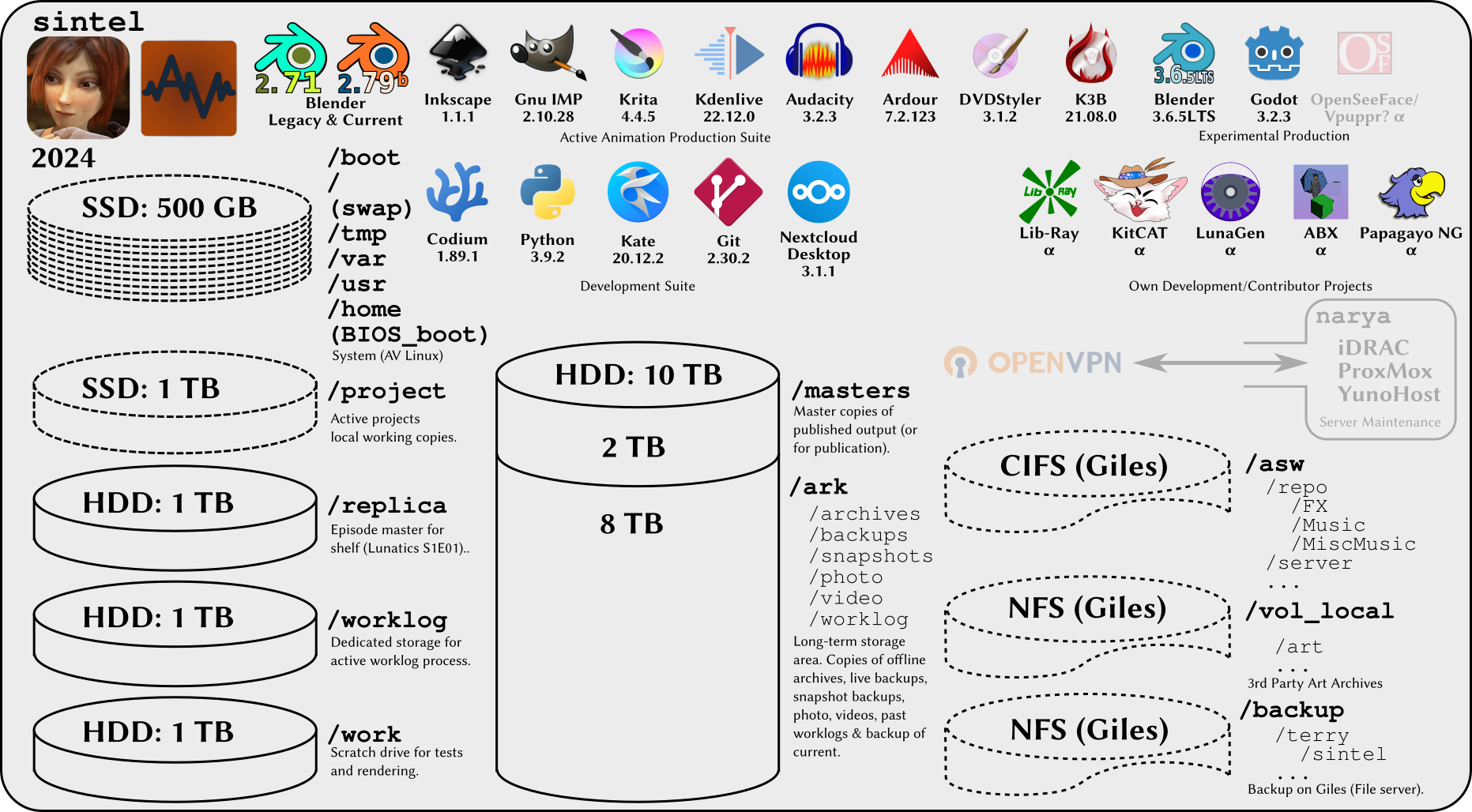 /replica: This is a kind of “understudy” drive, which has replicas of various other parts of the system, with the idea of creating a potentially bootable offline 3.5-in hard disk archive which will serve as episode source, EXR-stream, PNG-stream, and recovery platform. It is being built up to this and will then be removed and replaced when I release the “Lunatics!” pilot.