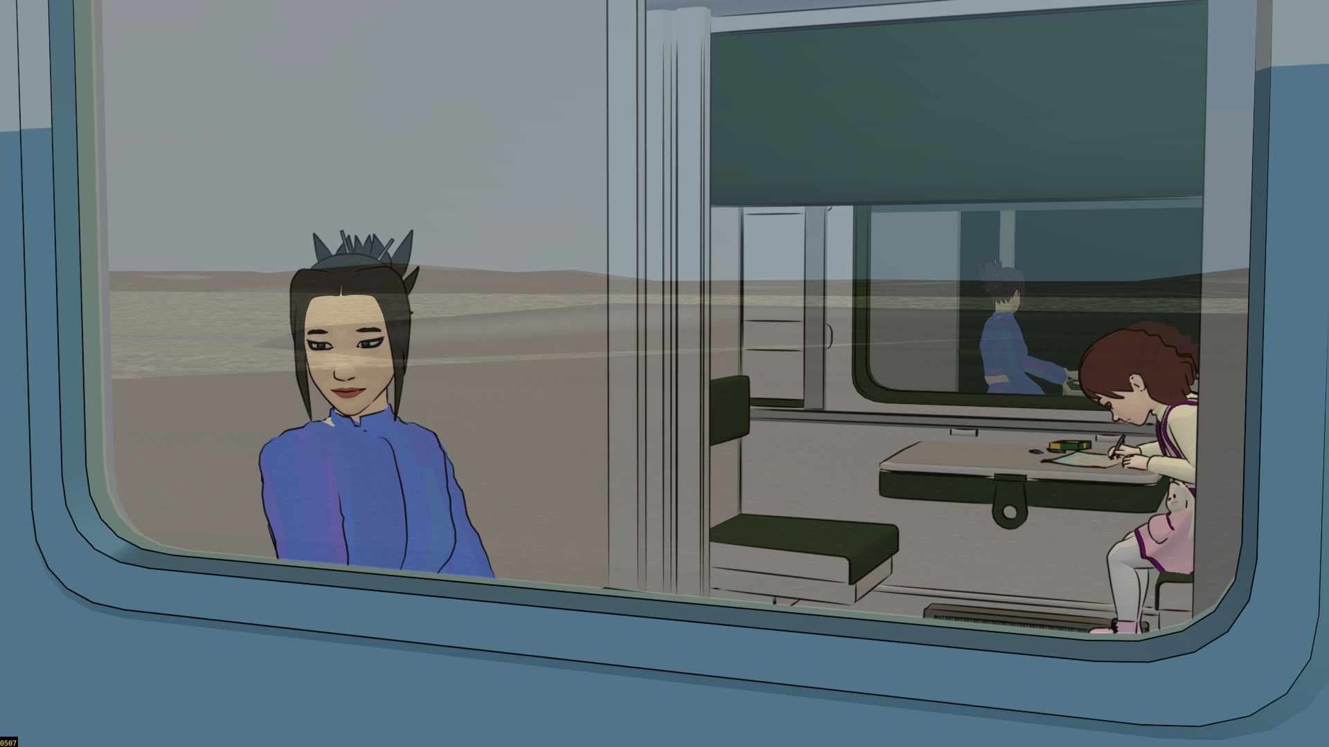 I put in a lot more work on final tweaks before rendering the version that I released on Patreon. I was not able to get much beyond this TR sequence finished, and I ultimately used the old version of the TR2 shot, because I had too much trouble getting the reflections of the camels to work right. This was a tricky thing about the TR2 shot, because Freestyle doesn’t support reflections in Blender, and yet I wanted the camels to be inked. So I implemented a “reflection camera” system to simulate the reflection. Since I had to rescale the exterior shot and since the interior of the train is also being composited with a mask, this became complicated enough that I could see I wasn’t going to finish it in time.