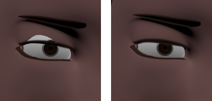 I set up color patch masks in the paint layer during compositing to correct the eyelid problem. In a way, I like having this there, because it demonstrates how this sort of problem can be fixed in compositing. Even though, it’s likely that I could track down the weight-paint problem if I really wanted to.