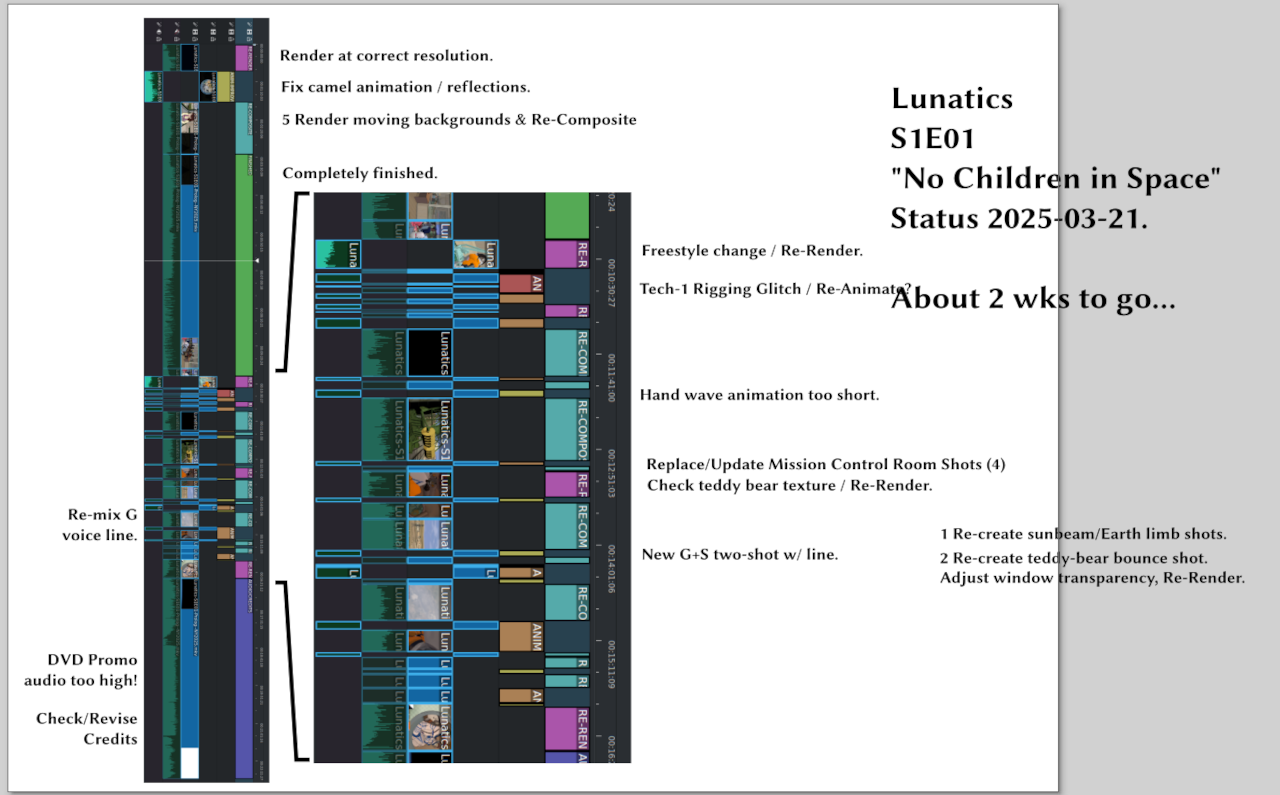 March 2025 was a heavy production month, as I attempted to make a April 12th deadline (sorry, that didn’t work out). Many small fixes to the Touring Baikonur, Press Conference, and Soyuz Rollout scenes. Also constructed a new replacement shot “SF-1-A” for the Soyuz Flight scene and started on the Suiting Up scene (work continued on that into May).