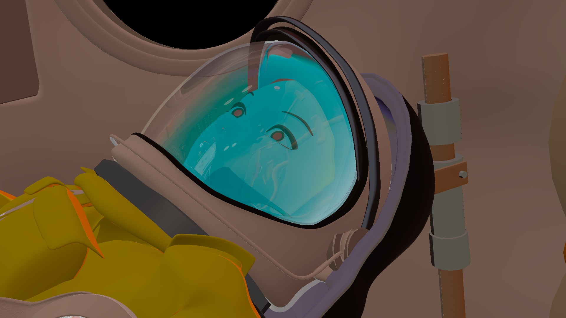 I then moved on to reconstructing the shot I now call “SF-1-C”, which has been a shot reused from the 2012 teaser trailer. It shows Georgiana reacting to sunlight shining into the spacecraft by turning away, when she then notices the Earth’s limb through her porthole. The style of modeling and animation has changed drastically since that shot was made, and the original now looks very out of place. Indeed, just about every asset in the shot has been remade since then.