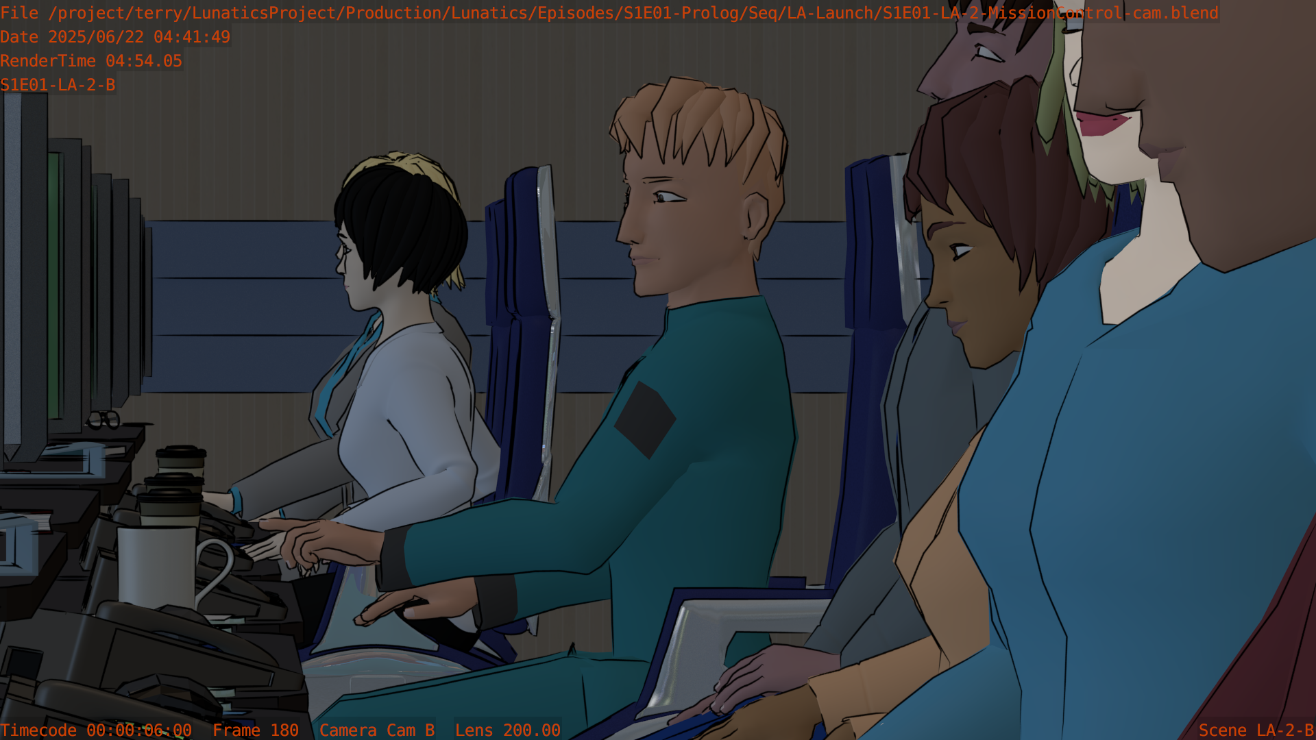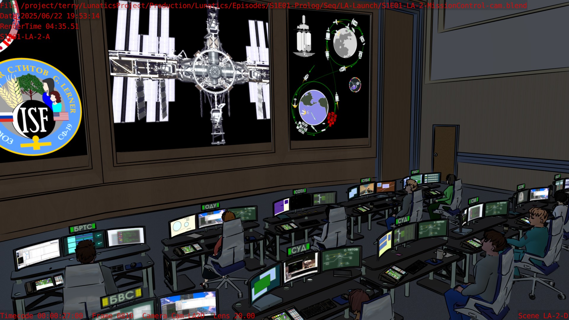 Blocked out the new/replacement LA-2 shots, which are set in the Mission Control Room. I have not yet gotten to the lip-sync animation, but I believe the camera moves are good now.