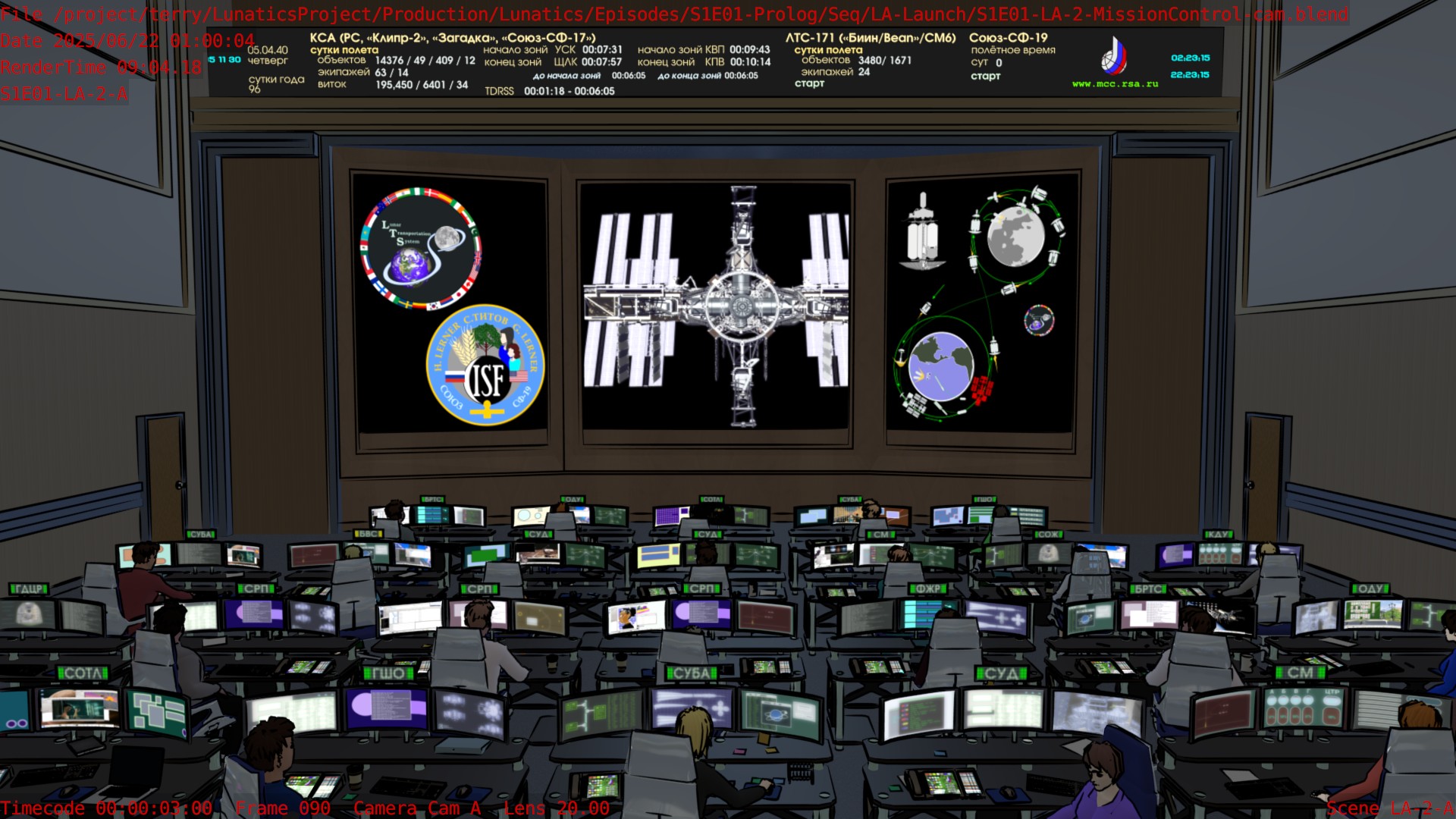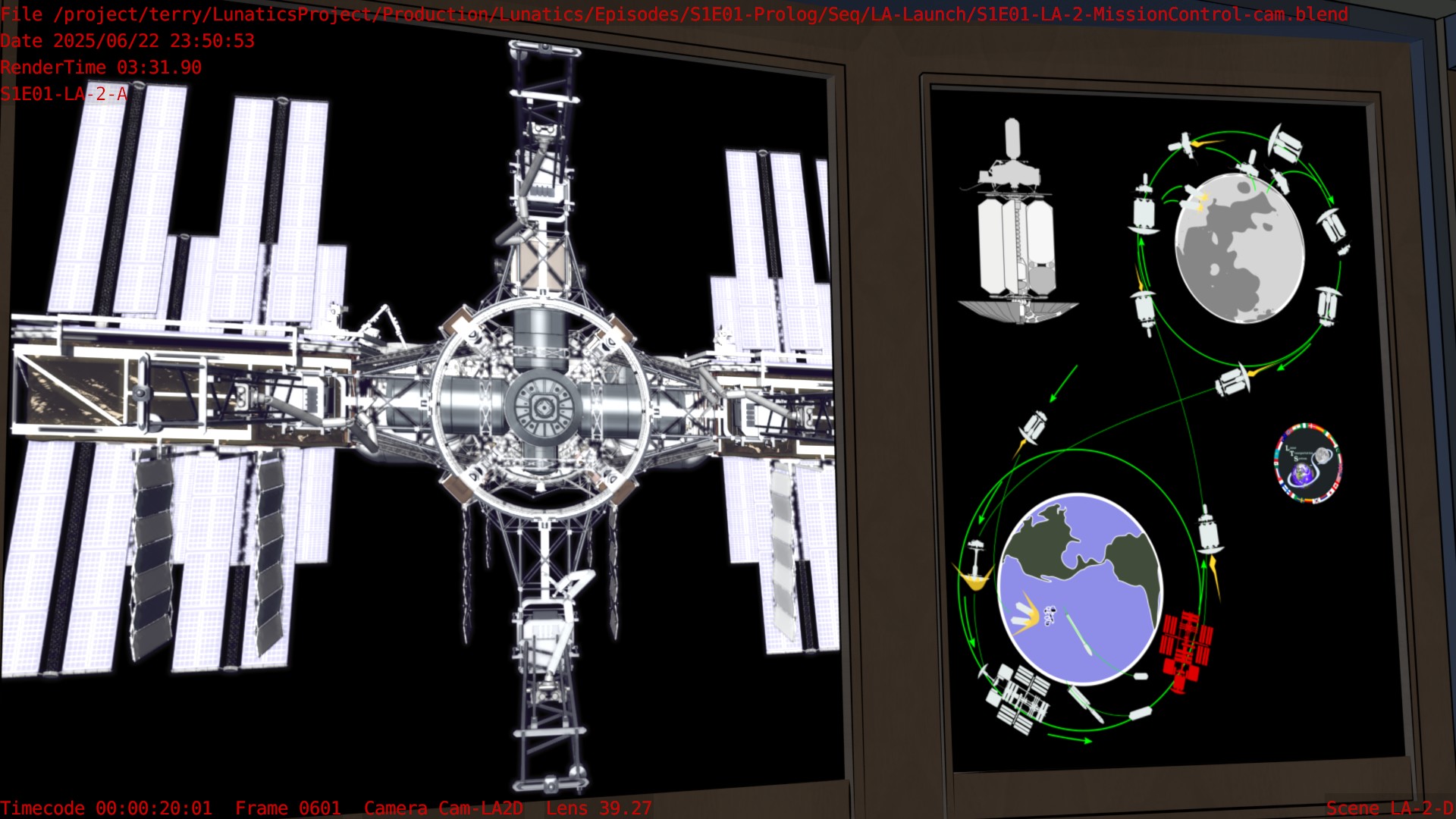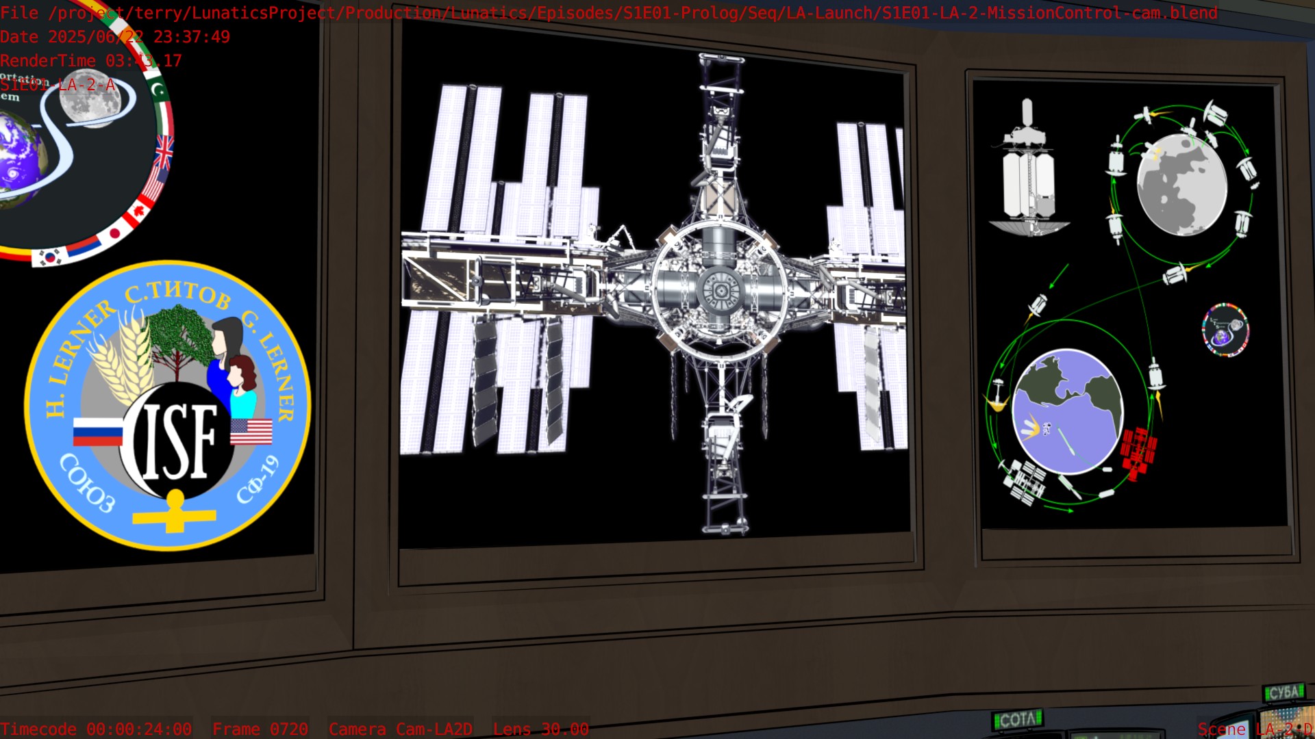 Found and corrected a problem with rendering the Soyuz interior shots. The console video texture was missing on the server, because it is stored in the Renders folder, since it is generated by a Kdenlive file in the source tree. But I had not set up my “pull_Lunatics.sh” script to fetch these files. I corrected the script, re-ran, and confirmed the shots are rendering correctly now.