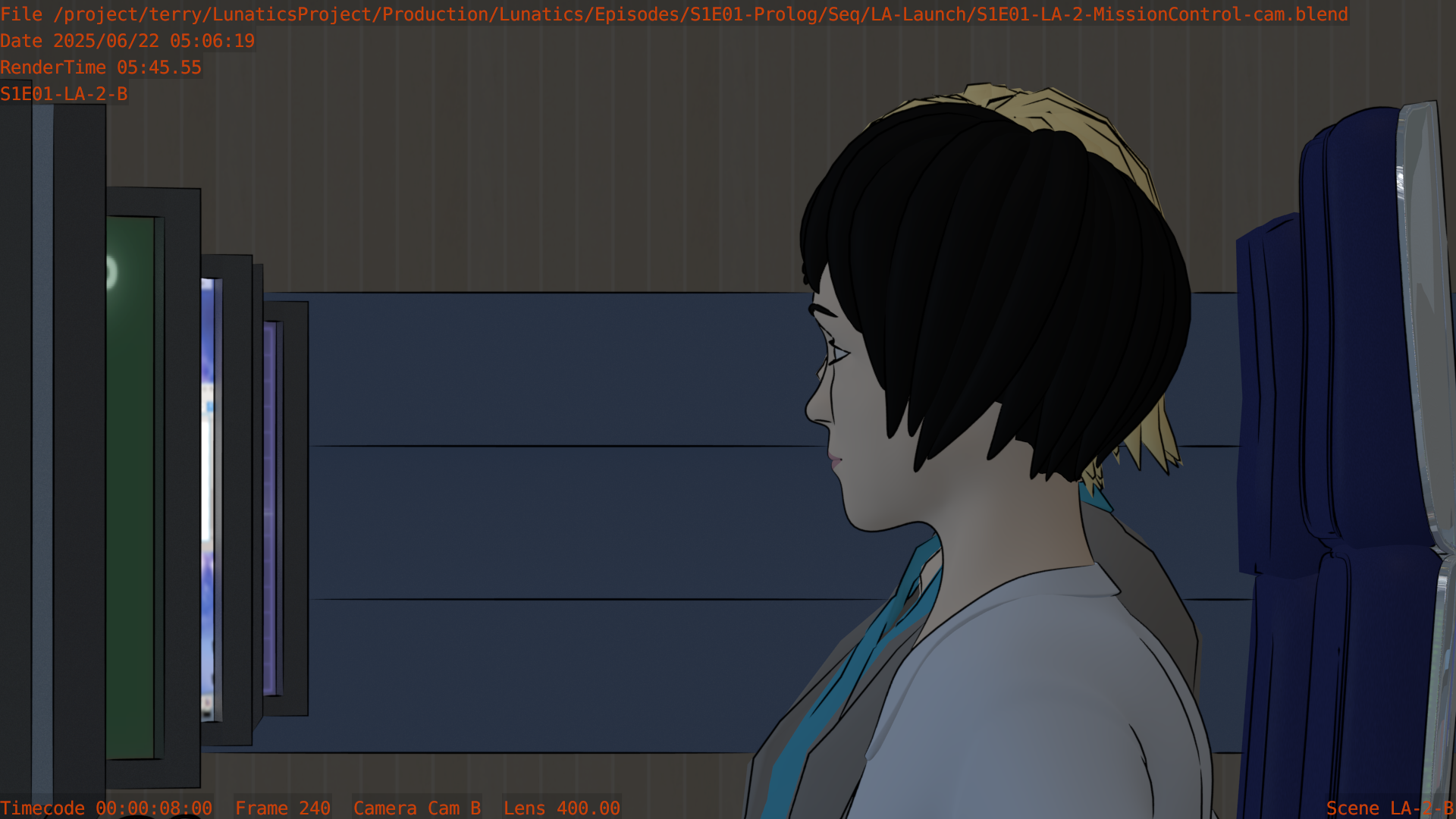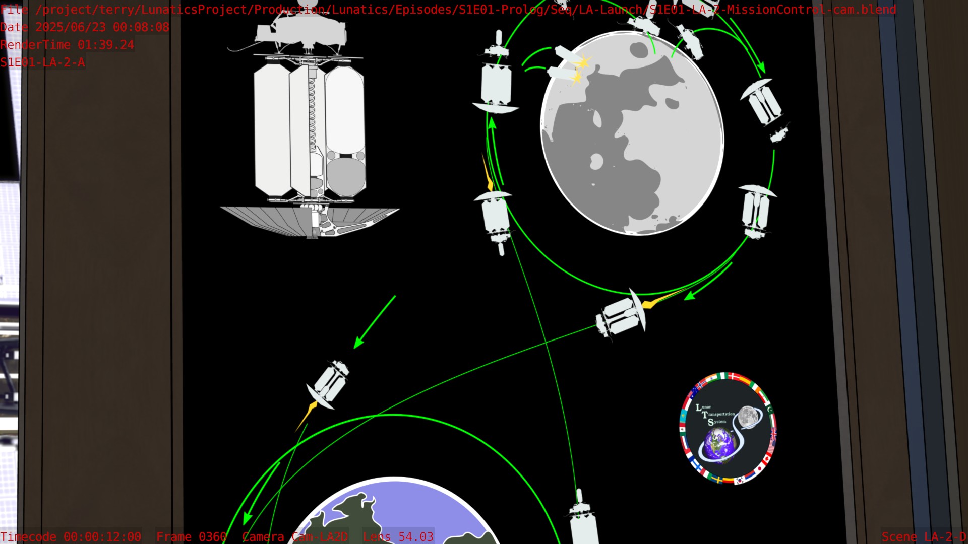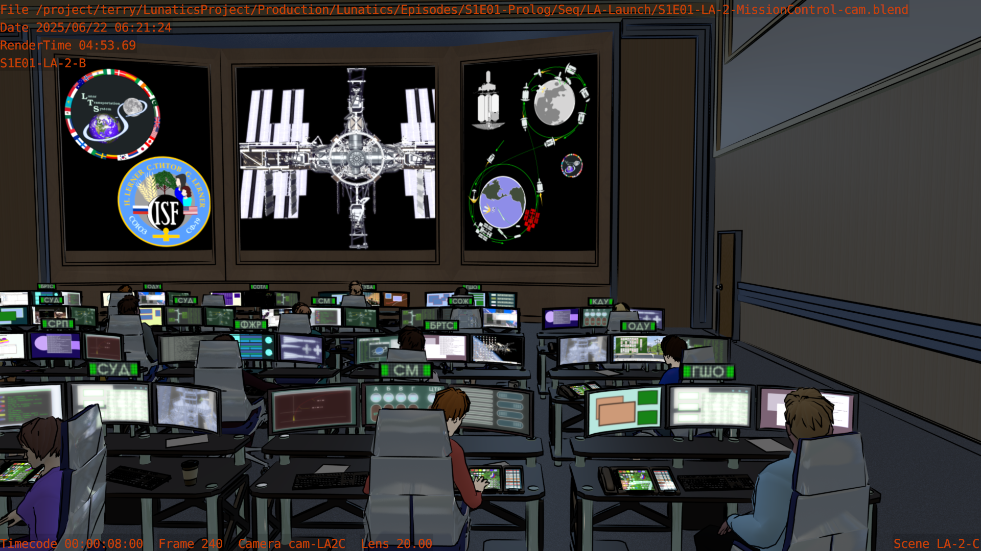 Found and corrected a problem with rendering the Soyuz interior shots. The console video texture was missing on the server, because it is stored in the Renders folder, since it is generated by a Kdenlive file in the source tree. But I had not set up my “pull_Lunatics.sh” script to fetch these files. I corrected the script, re-ran, and confirmed the shots are rendering correctly now.
