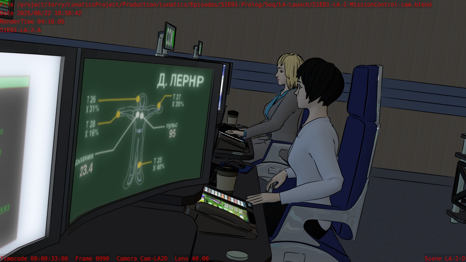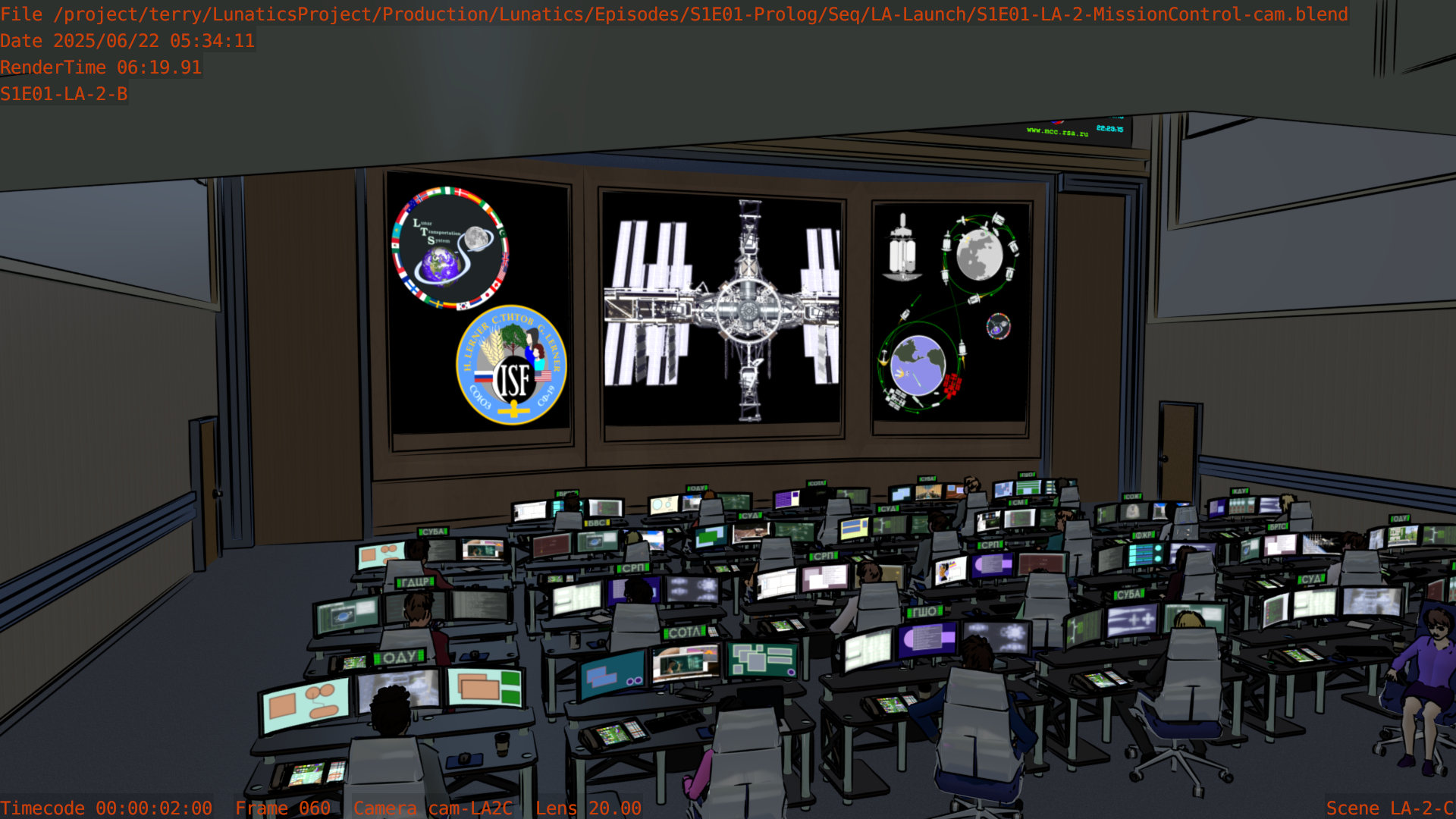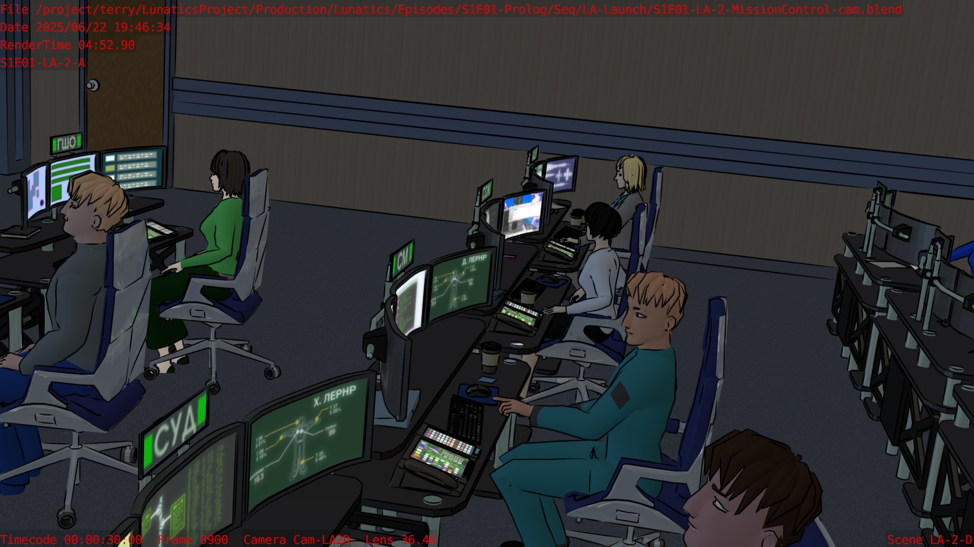 Blocked out the new/replacement LA-2 shots, which are set in the Mission Control Room. I have not yet gotten to the lip-sync animation, but I believe the camera moves are good now.
