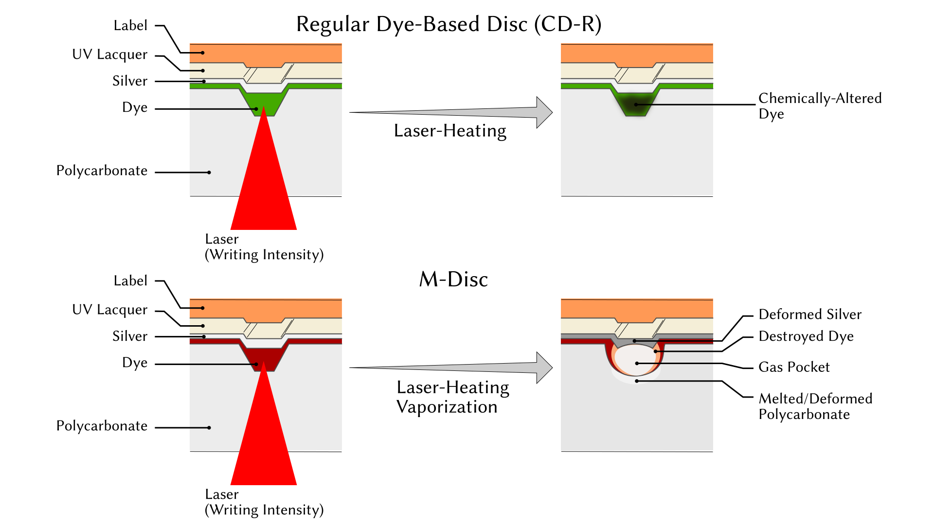 Writing to these discs does produce physical pits — essentially air pockets, which are much more durable than the scorch marks on dye-based media, and can’t fade. The writing energy from the laser in M-Disc compatible drives produces these pockets.
